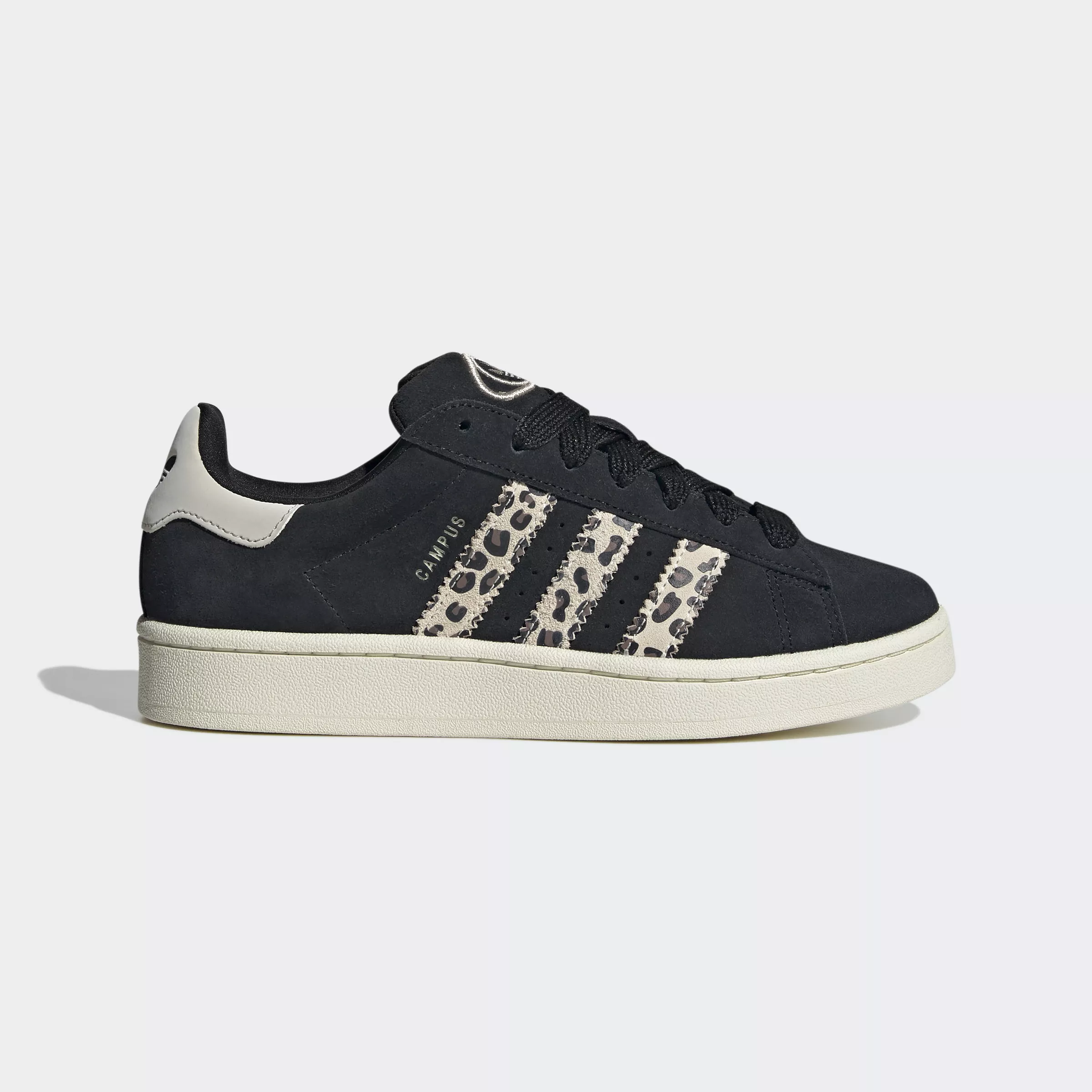 These Adidas Campus 00s sneakers feature a bold black suede upper paired with leopard-print stripes and heel tab. Finished with cream laces and an off-white sole, they deliver a stylish mix of retro design and modern flair.