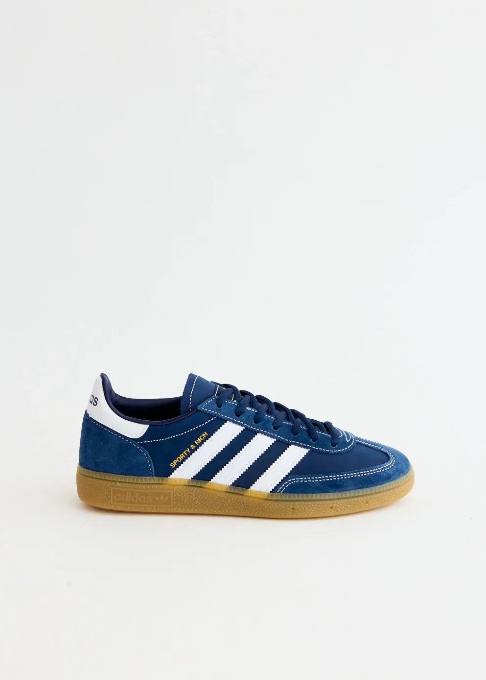 The Adidas x Sporty & Rich Handball Spezial in Night Indigo offers a timeless blend of vintage sportswear and modern luxury. Crafted with a deep navy suede upper, crisp white leather accents, and refined gold foil branding, this collaboration elevates the classic Handball Spezial silhouette with understated elegance and everyday versatility.