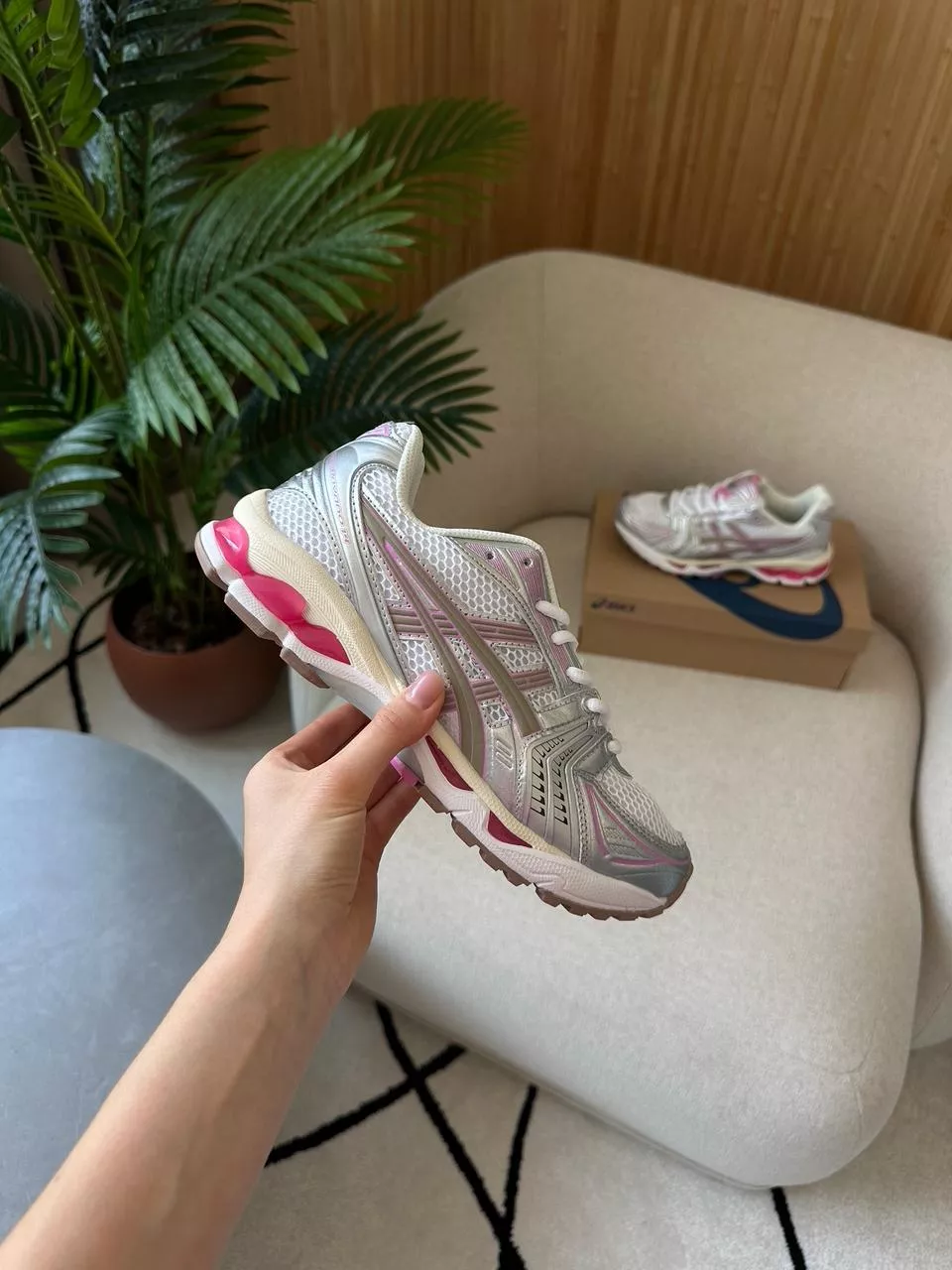 The ASICS GEL-Kayano 14 in white, silver, and pink (Cream Sweet Pink) combines vintage design with modern comfort. Featuring a breathable mesh upper, synthetic overlays, and bright pink accents on the midsole, this model blends sporty style with cushioning support for all-day wear.