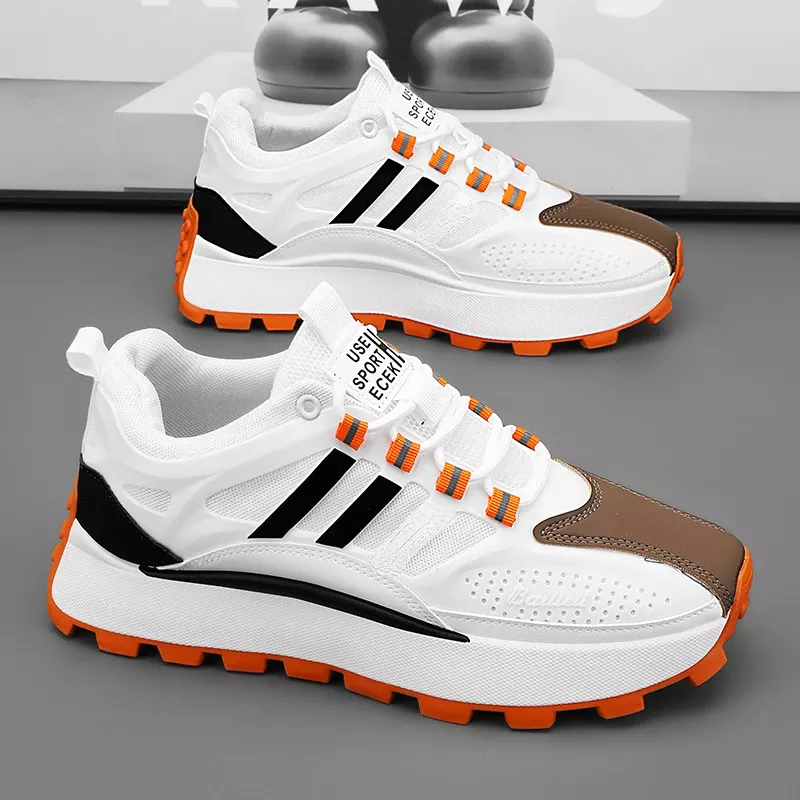 The Bailleli Sneaker is a bold, stylish chunky sneaker designed for everyday comfort and standout streetwear appeal. It features a clean white upper paired with contrasting black stripes, a tan/brown toe cap accent, and bright orange outsole touches that give the shoe its signature eye-catching look. Built for durability and comfort, it blends fashion-forward design with practical cushioning ideal for daily wear.