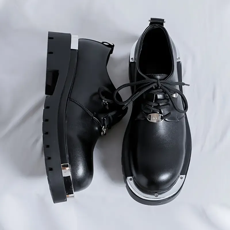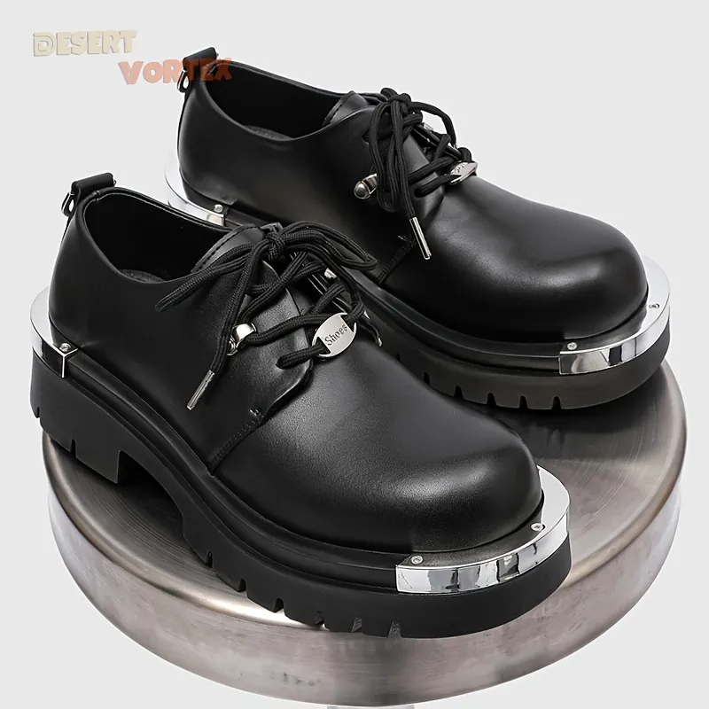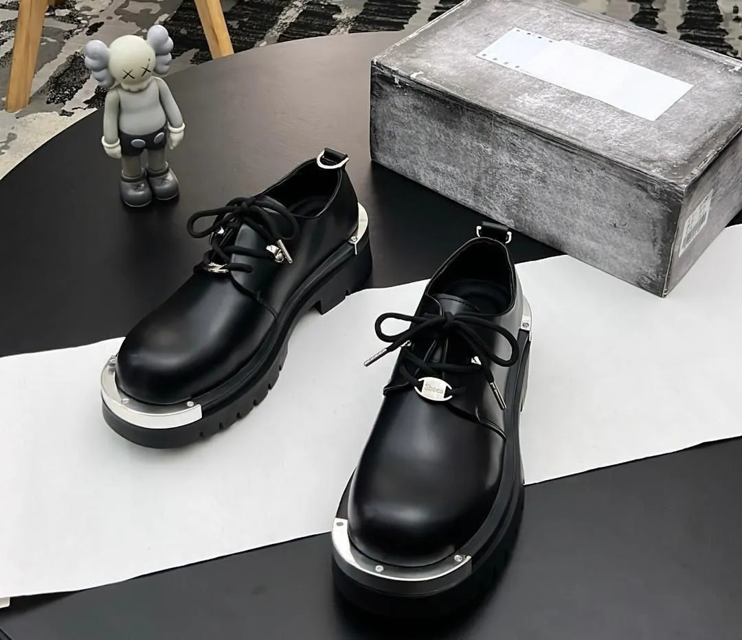 The Balenciaga Metal-Toe Derby (Heavy Duty Shoe) blends a classic Derby silhouette with an industrial edge. Featuring a silver-toned metal toe plate, chunky rugged sole, and an all-black leather upper, it delivers a bold, avant-garde look suited for modern formal or streetwear styling.