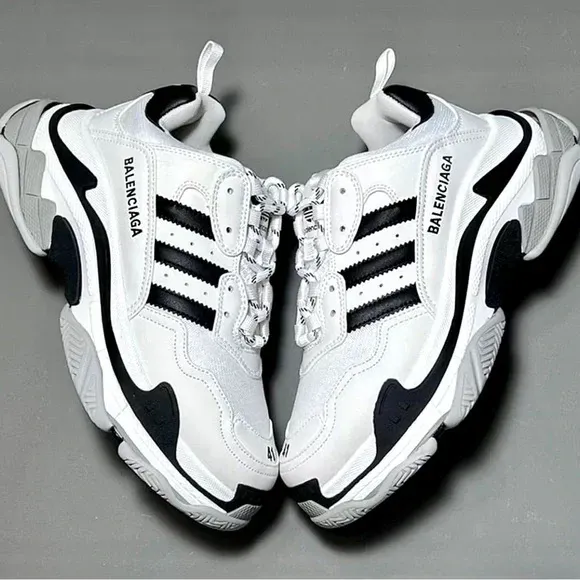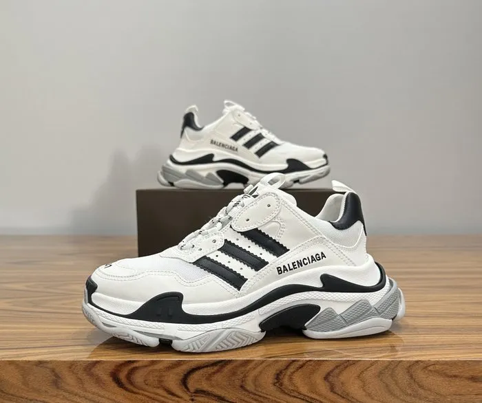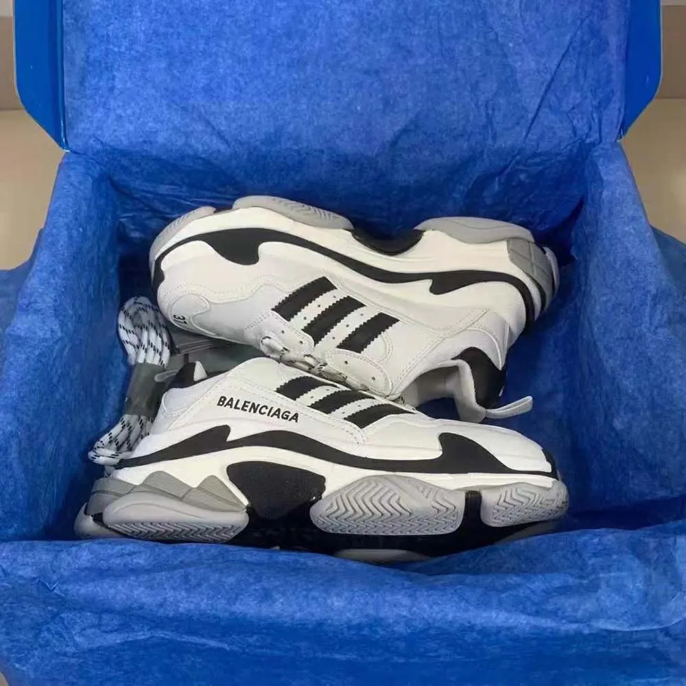 Premium collaboration sneakers combining Balenciaga’s iconic Triple S chunky silhouette with Adidas three-stripe detailing. Built with layered panels and a multi-stack sole for bold streetwear style and durability.