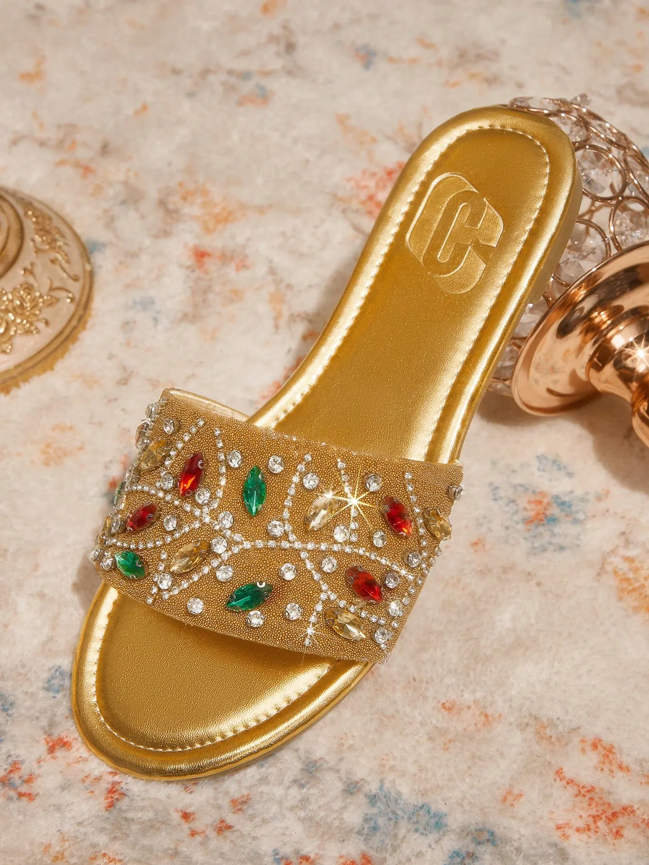 Bamboo Gemstone Flat Slide Sandals — Tan Multi