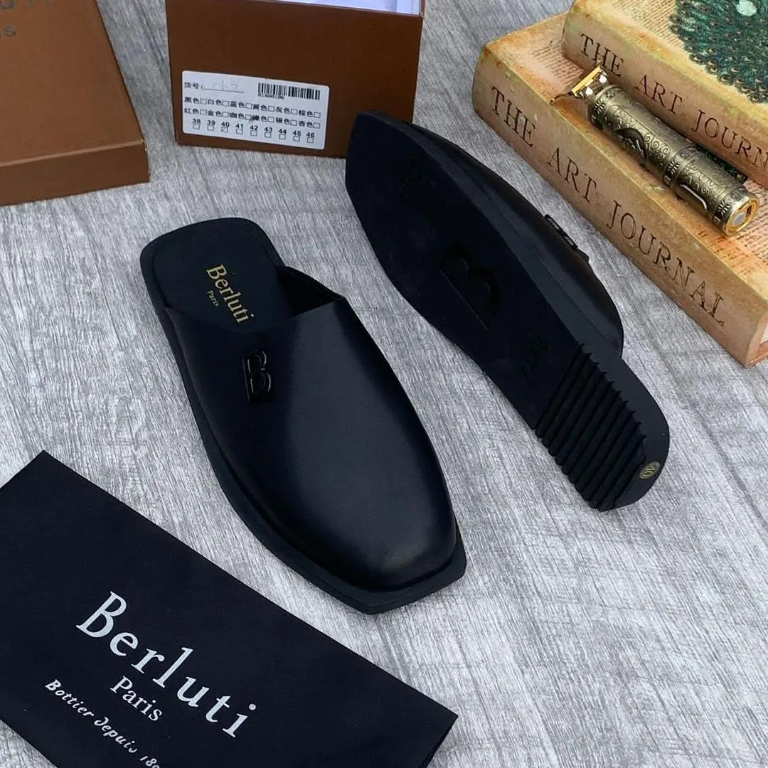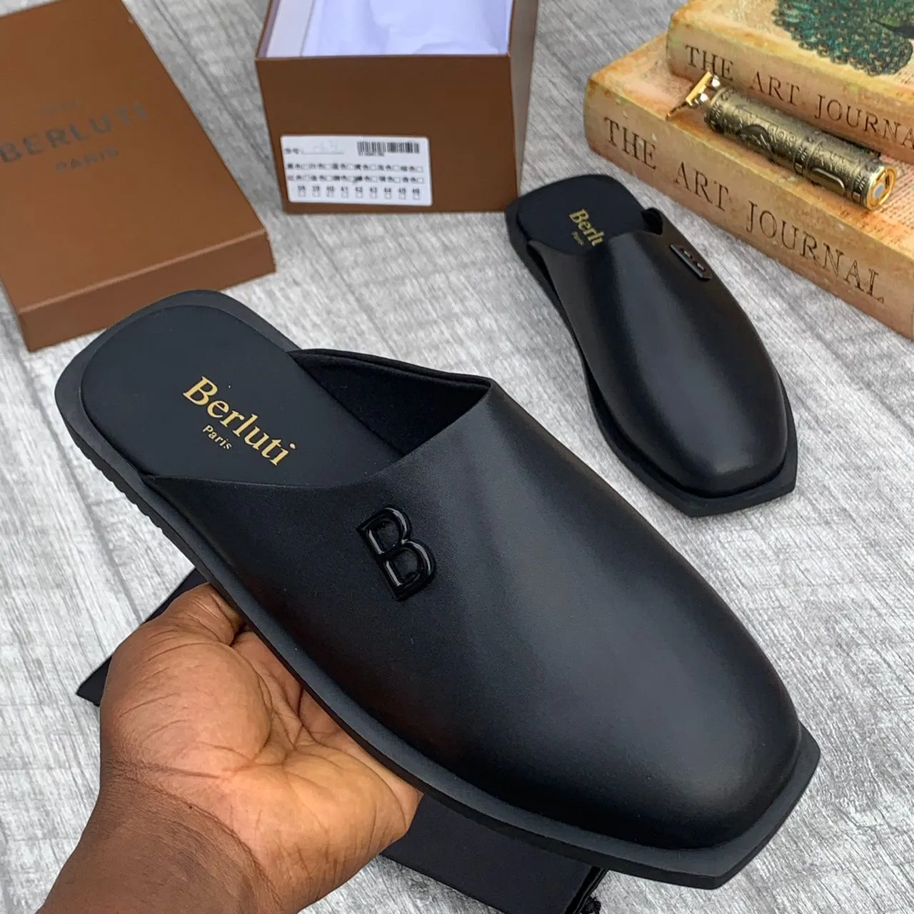 The Berluti Half Shoe Mule in black blends classic luxury with modern ease. Designed in a refined mule silhouette, it features a sleek leather upper accented with Berluti’s signature “B” logo on the vamp, offering effortless slip-on sophistication for elevated casual or smart wear.
