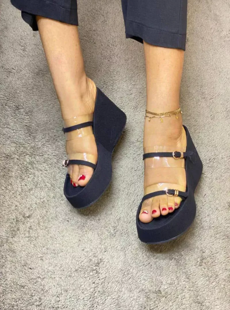 These stylish wedge sandals combine a black platform base with two clear vinyl straps and gold adjustable buckles. Designed for a chic, modern look, they offer height, comfort, and versatility for both casual and dressy outfits.