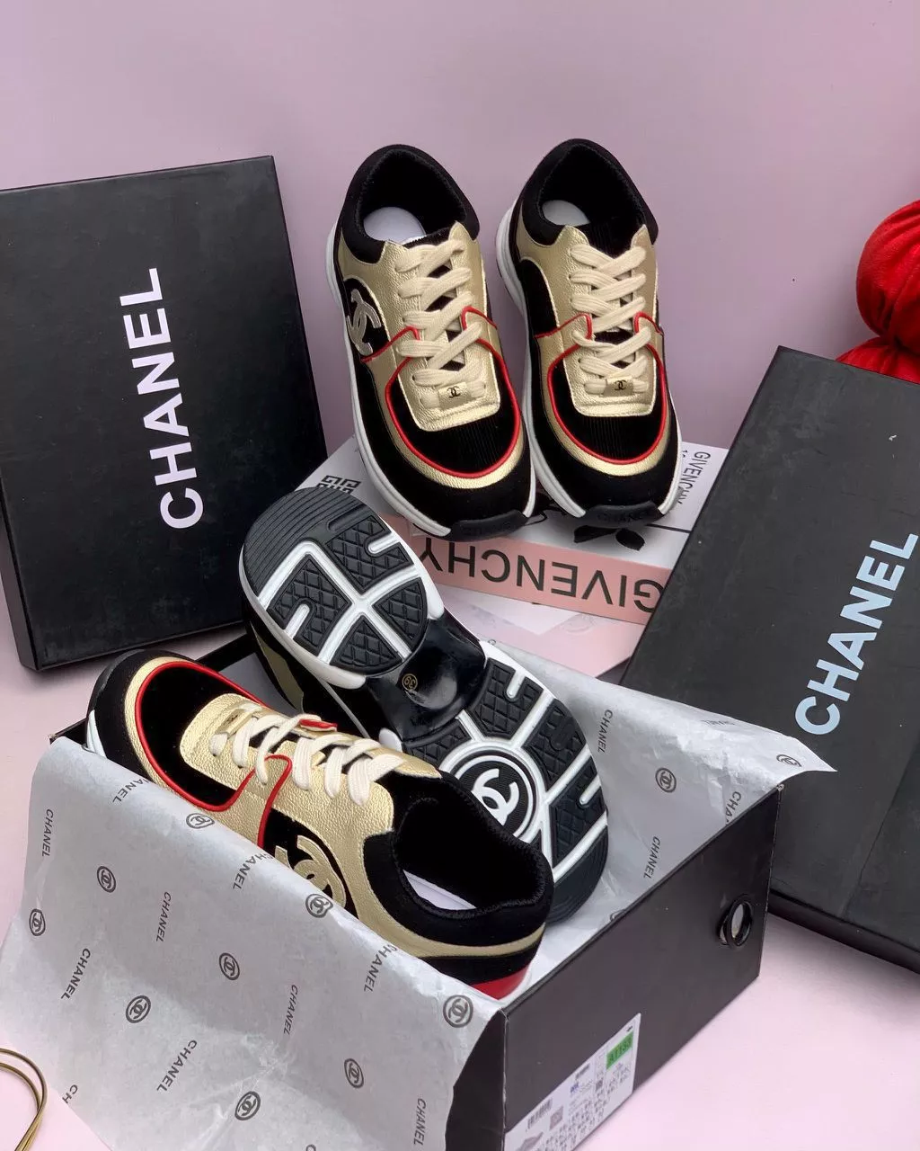 Luxury sneakers featuring Chanel’s signature interlocking CC logo, blending premium craftsmanship with a sleek, modern design. A versatile pair that elevates both casual and stylish looks.