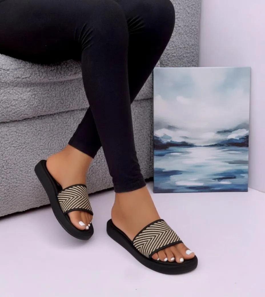 Chevron Strap Flat Slide Sandals – Black & Beige