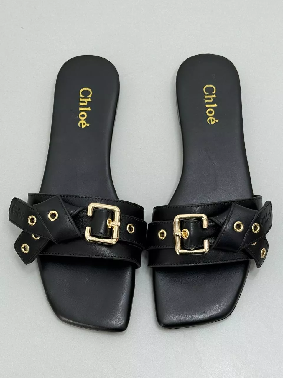 The Chloé Mae Slide Sandals in black combine timeless elegance with modern detailing. Crafted from smooth black leather, they feature signature gold-tone buckle embellishments and refined eyelet accents, perfect for sophisticated casual or dressy looks.