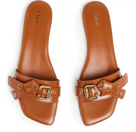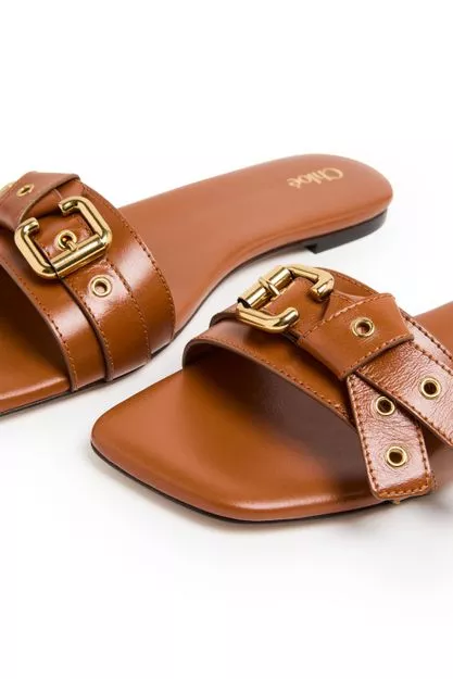 The Chloé Mae Slide Sandals in nude feature a minimalist design crafted from smooth, high-quality leather. Accented with gold-tone buckles and eyelet details, these slides offer a sophisticated touch, ideal for pairing with both casual and elegant outfits.