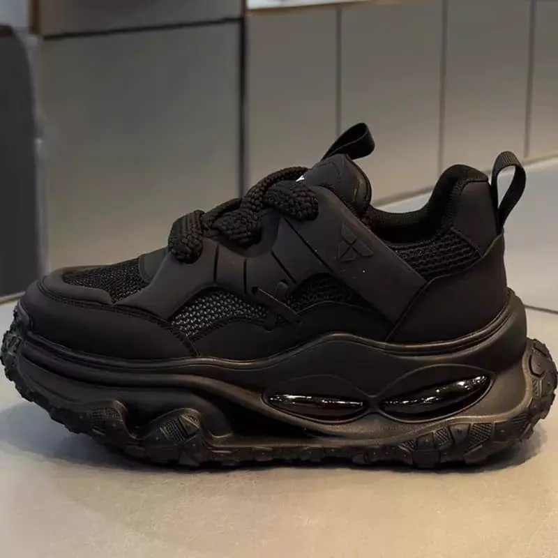 Elevate your streetwear look with the Chunky Air-Cushioned Sneakers in Black. These bold sneakers combine a high-fashion silhouette with all-day comfort. The design features layered synthetic leather and mesh materials that provide breathability and durability. With its thick, sculpted air-cushioned sole, this pair ensures excellent shock absorption and stability while adding a trendy edge to any outfit. Perfect for both men and women who love versatile, statement footwear.