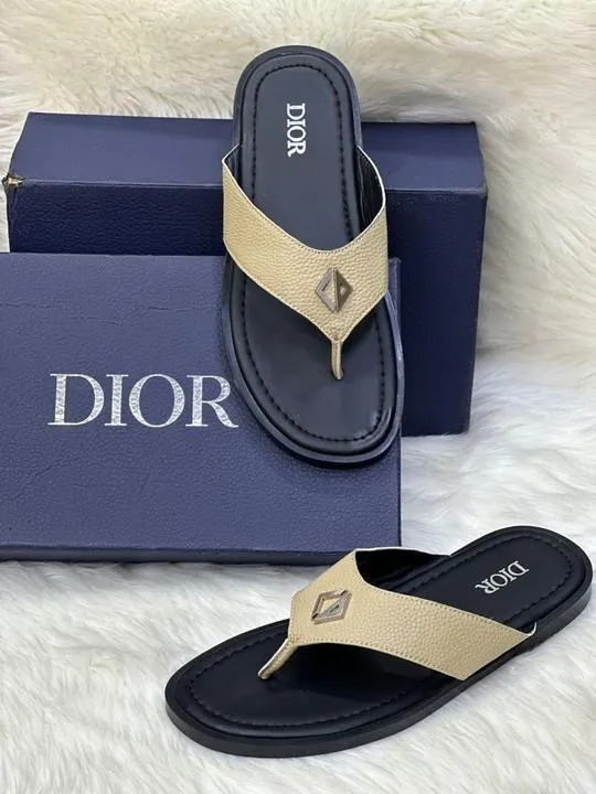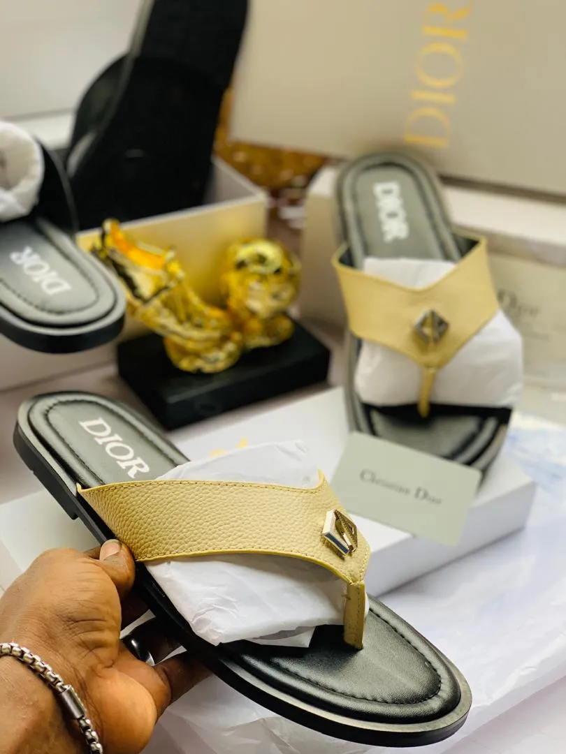 These Dior slide slippers feature a refined beige strap contrasted with a black sole, showcasing the iconic Dior branding. Designed for effortless luxury, they offer a stylish slip-on design suitable for casual and resort wear.
