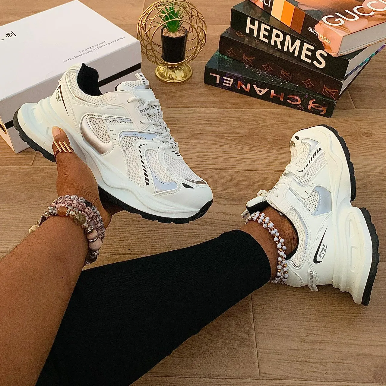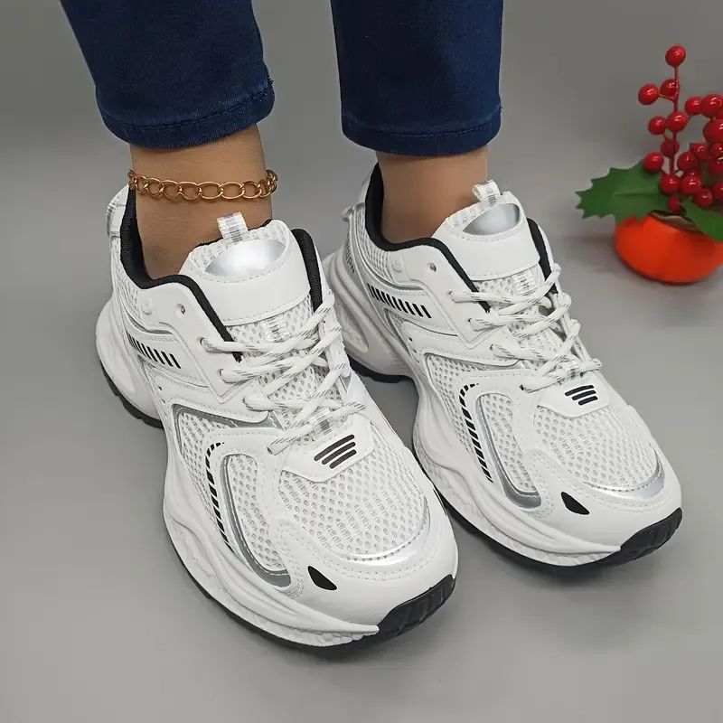 These white chunky dad sneakers deliver a bold, on-trend look with everyday comfort. Designed with a breathable mesh upper and a thick platform sole, they offer a sporty, fashion-forward style that pairs easily with casual and streetwear outfits. The subtle silver/grey accents add a modern touch to this versatile design.