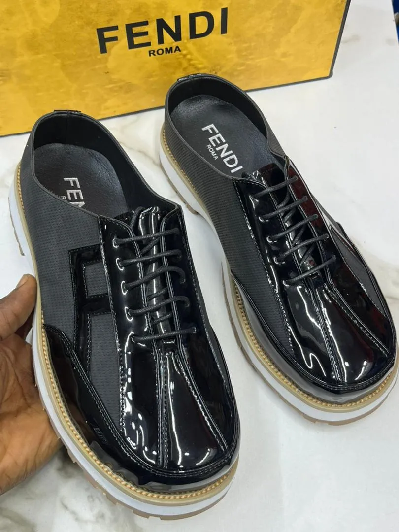 These Fendi derby shoes feature a sleek black upper with a refined mix of patent leather and textured fabric, finished with a contrasting white sole. Designed for a modern luxury look, they are ideal for corporate, formal, or smart-casual wear.