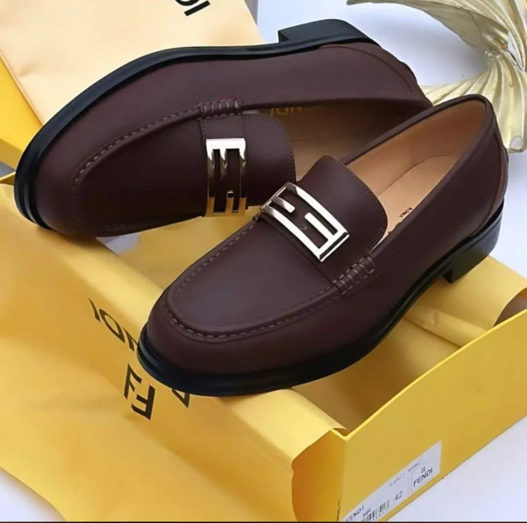These Fendi O'Lock loafers feature smooth brown leather with a structured silhouette, visible stitching, and the signature gold-finish O'Lock hardware on the vamp. Designed for premium comfort and timeless elegance, they offer a polished look suitable for both formal and upscale casual wear.