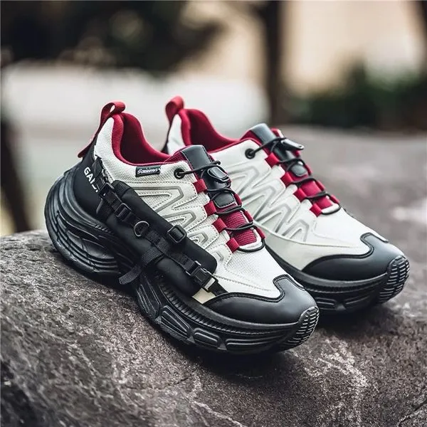 Modern sport sneakers designed in a bold black and white base with vibrant reddish-orange/coral accents on the laces and sole. Built for everyday comfort with a lightweight feel and eye-catching contrast details.