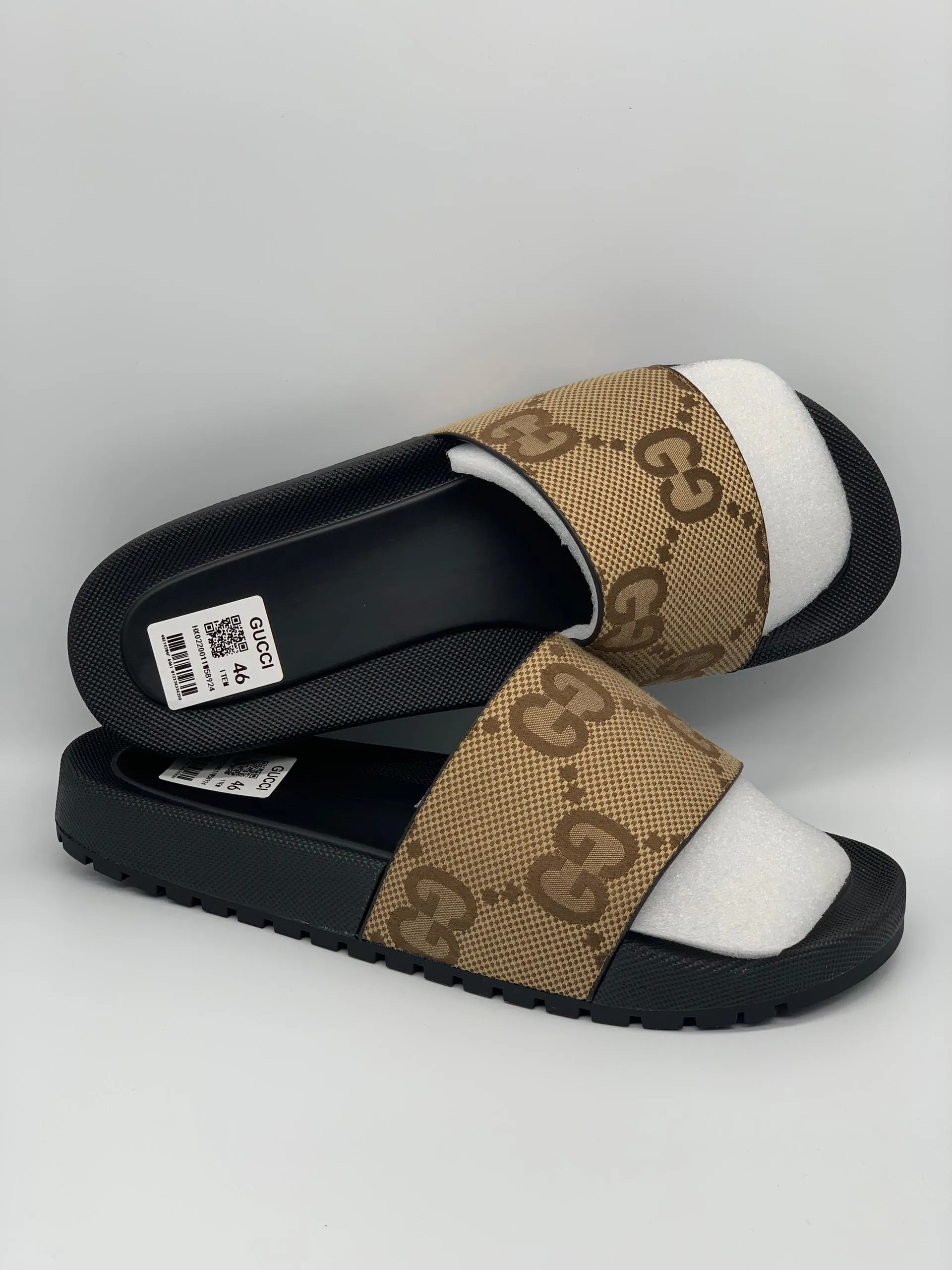 The Gucci GG Slide Sandals combine iconic house codes with an easy, slip-on silhouette. Featuring the signature GG monogram strap in beige and ebony, accented by Gucci’s classic green and red web, this slide is finished with a sleek black sole for contrast. Effortlessly stylish and instantly recognizable, it’s a go-to choice for refined casual and resort wear.