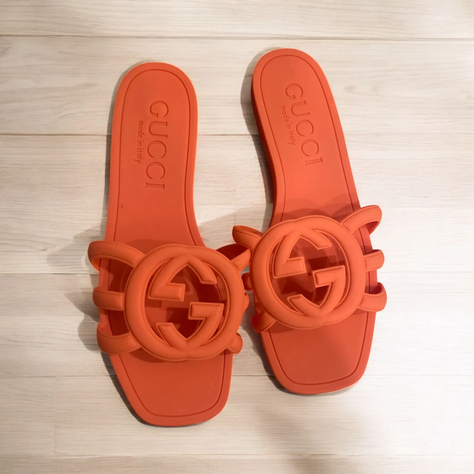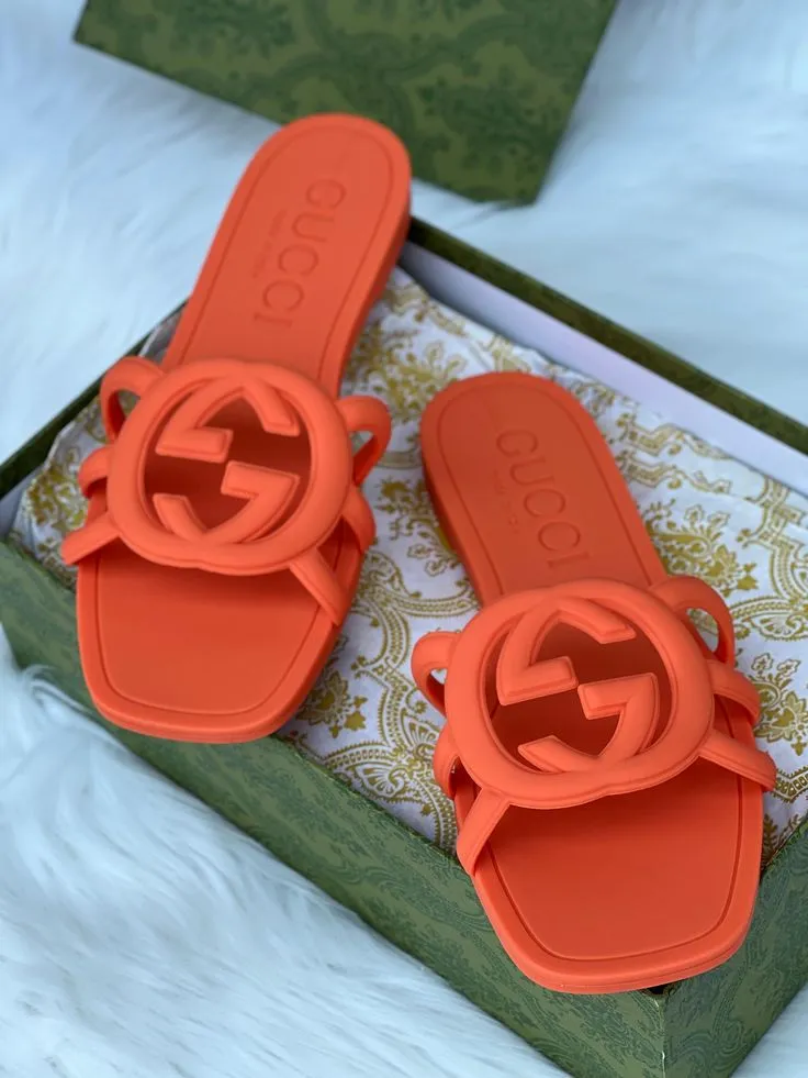 Step out in style with these vibrant orange Gucci Interlocking G Rubber Slides. These slides are perfect for a casual day out or a poolside party. They feature Gucci's iconic Interlocking G logo and are made with high-quality, durable rubber.