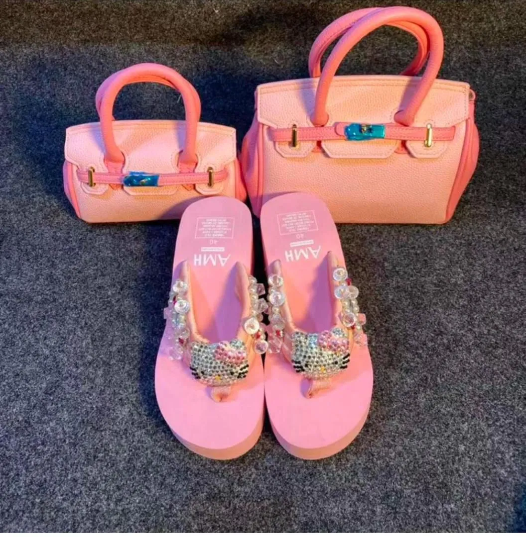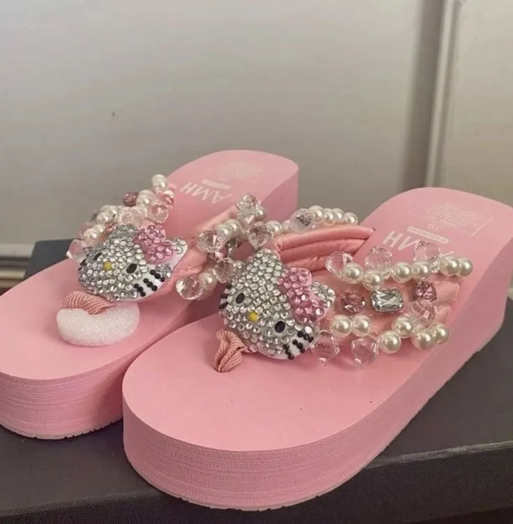 Cute and stylish Hello Kitty platform flip-flop sandals featuring a pink base with pearl and rhinestone embellishments. Designed for comfort and a playful fashion look, perfect for casual outings.
