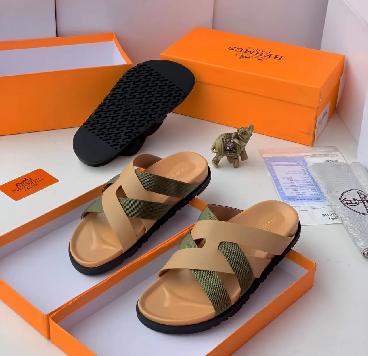 The Hermès Kazimir Sandal in tan and olive offers a refined, earthy take on the brand’s iconic slide silhouette. Featuring interlaced cross straps inspired by the Hermès “H” motif, this version blends a light tan (honey) tone with olive/khaki accents for a sophisticated yet relaxed look. Crafted with premium materials and a comfortable sole, it’s ideal for elevated everyday wear.