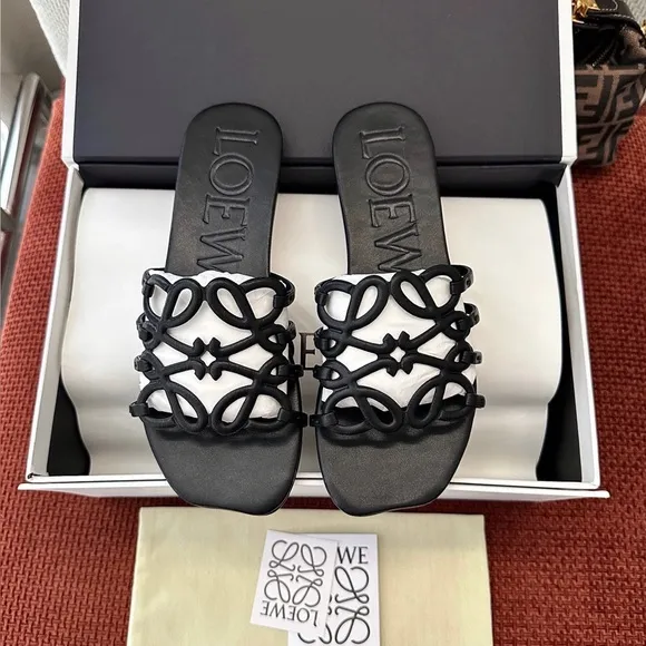The Loewe Petal Anagram Slide in black is a refined slip-on sandal crafted from soft calfskin leather. It features the iconic petal-shaped Anagram cut-out, delivering a sleek, minimalist luxury look suitable for everyday wear.