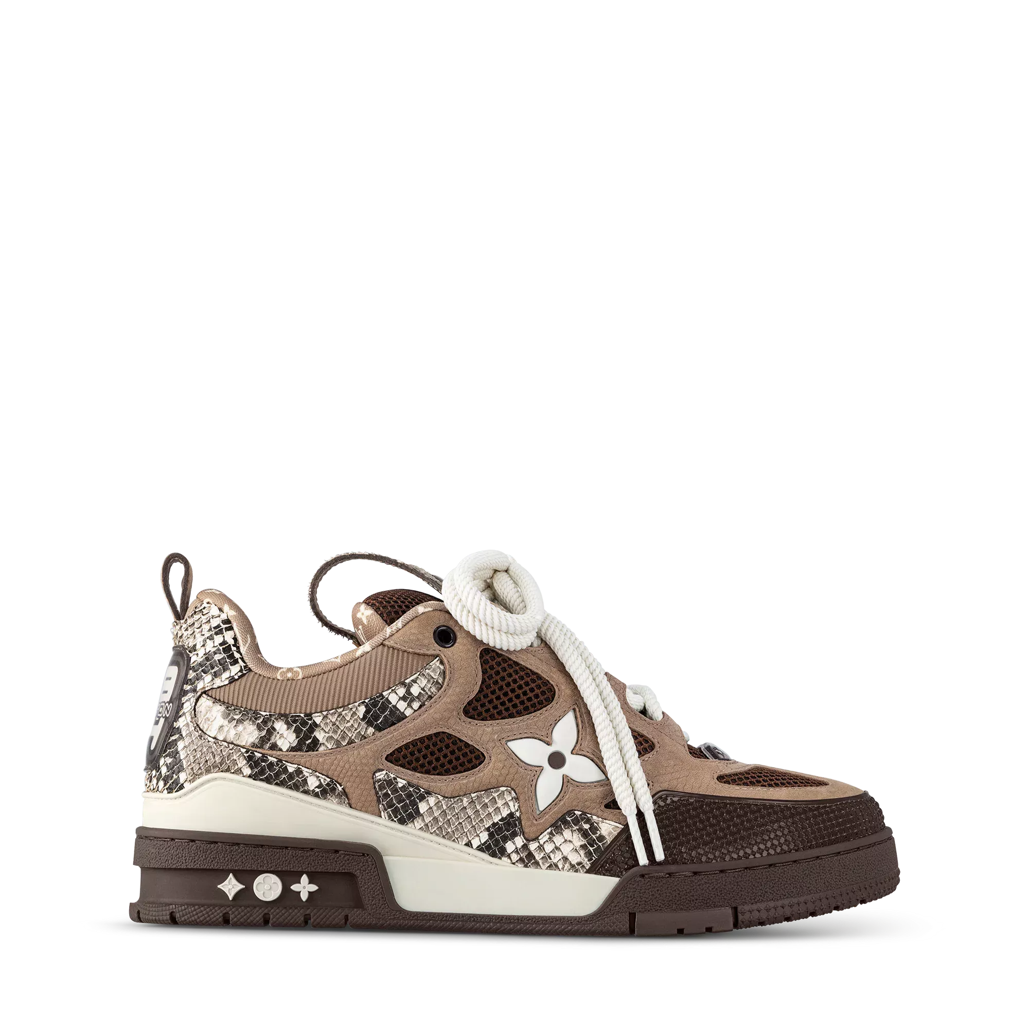 The Louis Vuitton LV Skate Sneaker brings a bold 90s-inspired look, crafted from technical mesh, calf leather, and suede with a snakeskin-effect finish in brown and cream. Featuring double laces, Monogram Flower accents, and Vuitton signatures, it blends luxury with streetwear edge.