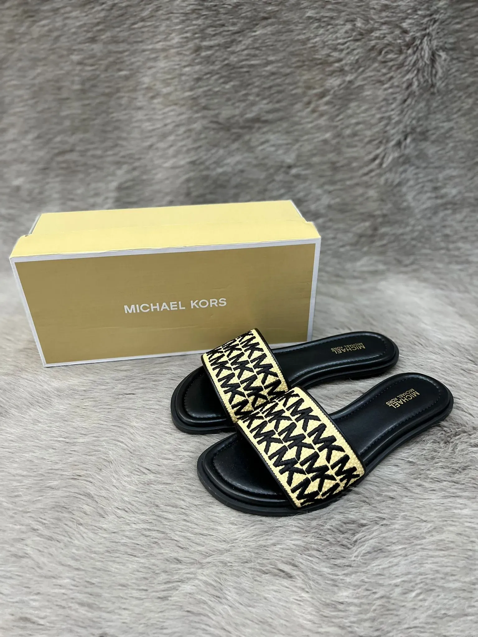 Michael Kors Sadler Metallic Logo Slide – Black/Tan