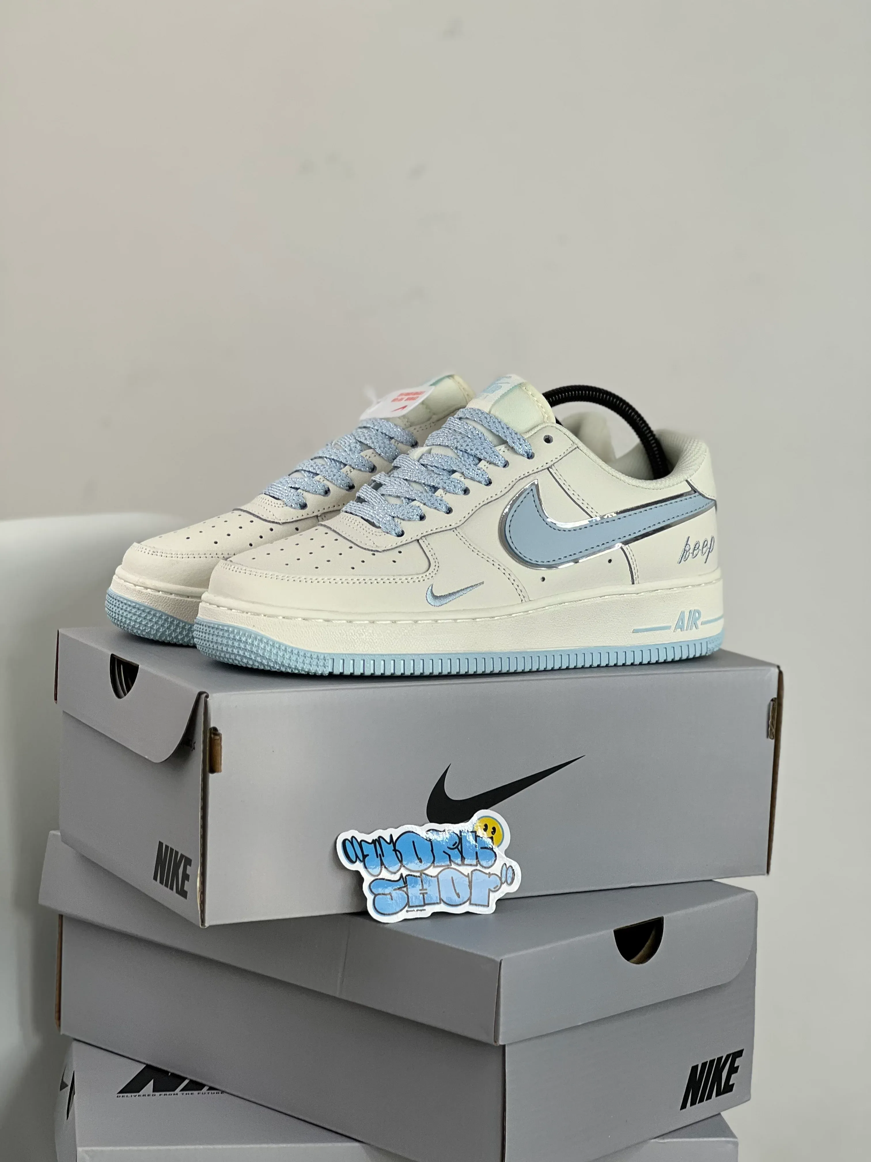 Classic low-top sneakers designed in a beige/tan upper with blue accents and a clean white midsole. The “Keep Fresh” edition features special tongue detailing with “keep” and “-AIR-” text, blending iconic street style with modern refreshed aesthetics.