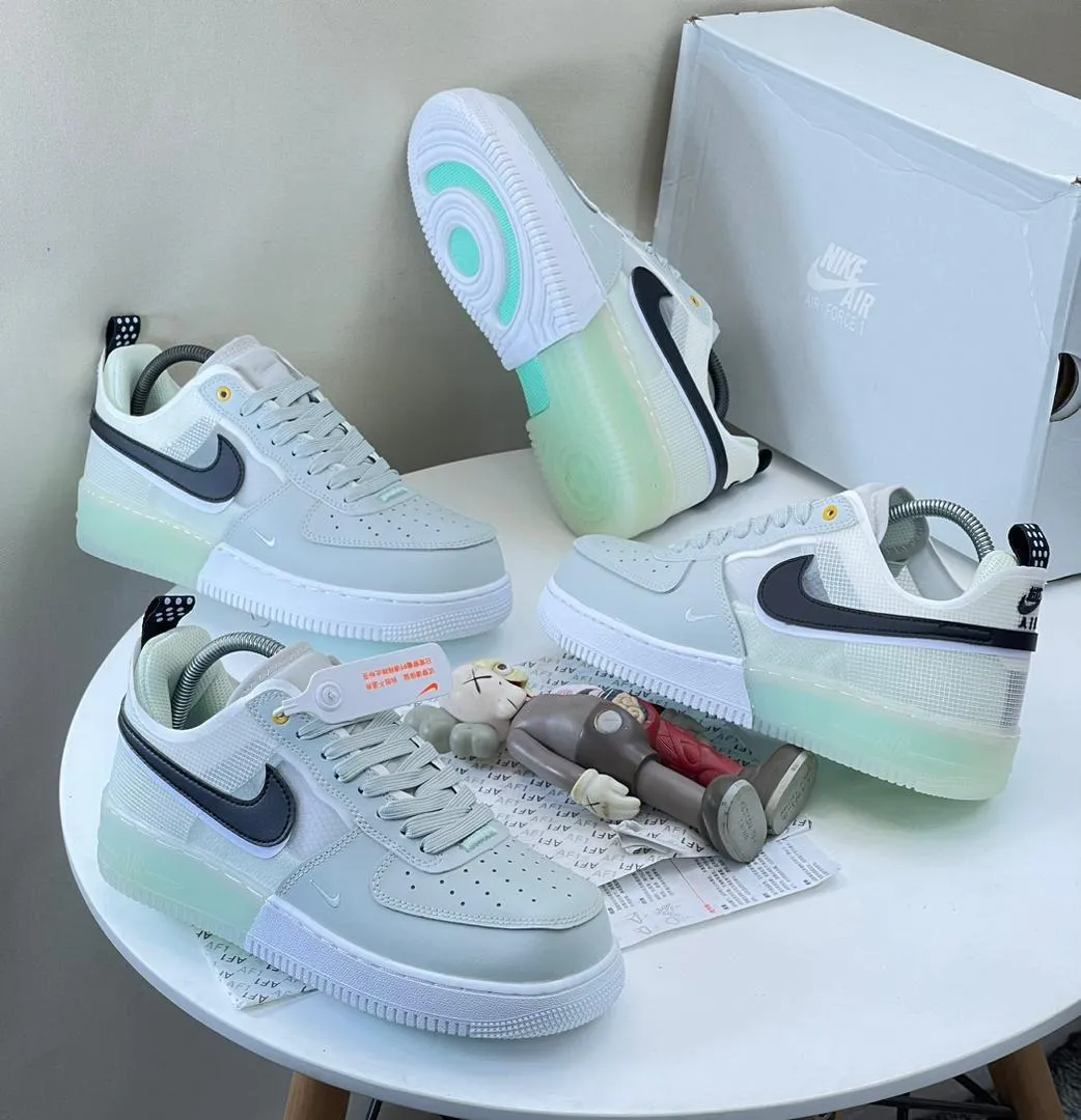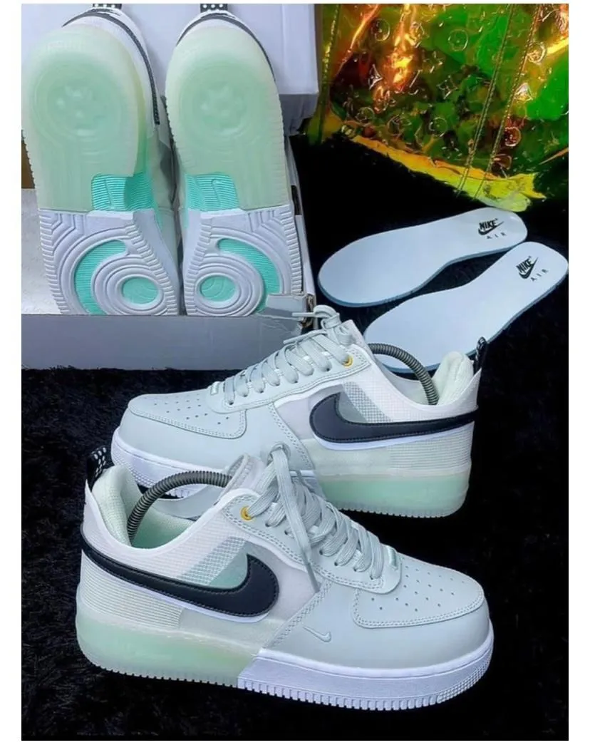 Modern upgrade of the classic AF1 featuring Nike React cushioning for lightweight comfort. Designed in a Photon Dust and White base with Mint Foam translucent sole accents and Olive Aura Swoosh detailing for a fresh lifestyle look.