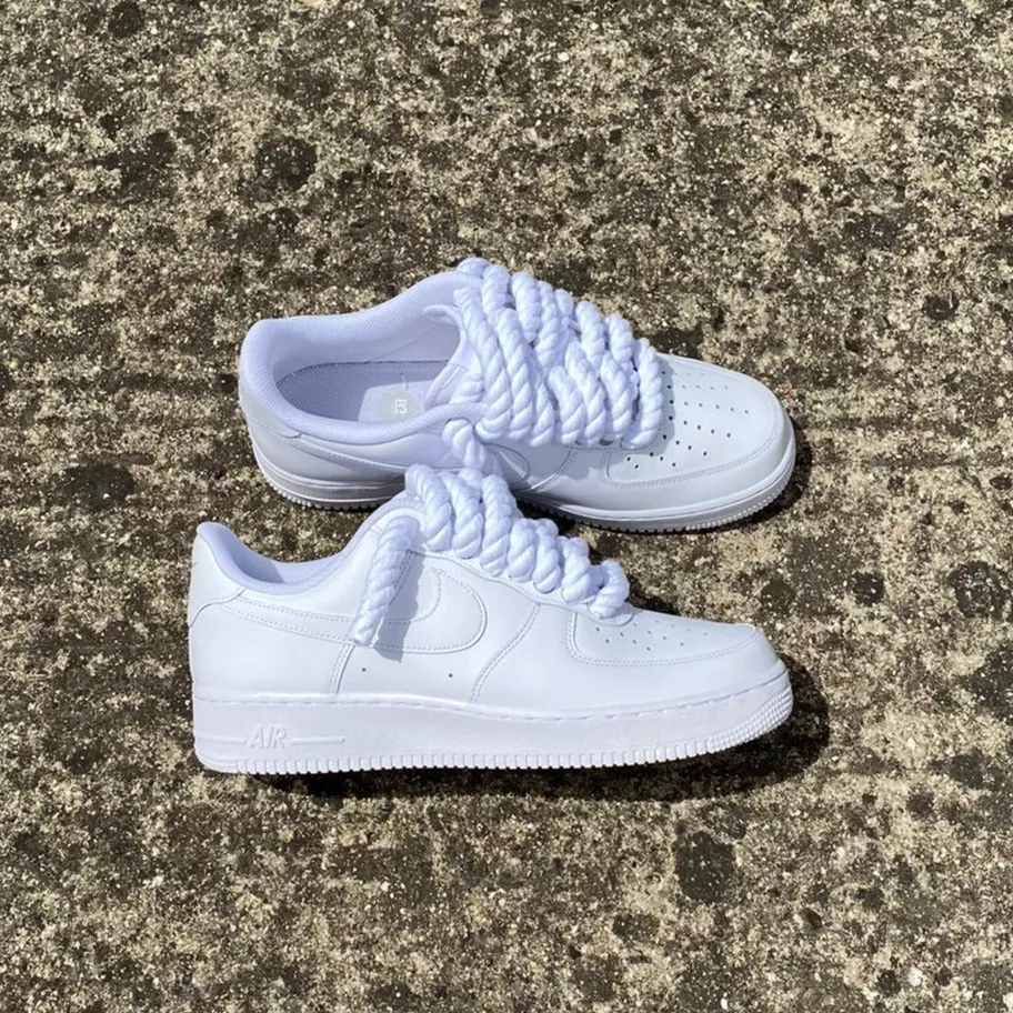 The Nike Air Force 1 “Triple White” is a timeless sneaker known for its clean design and everyday versatility. This version features custom thick rope laces, adding a bold twist to the classic silhouette. Crafted from premium white leather with the iconic “AIR” branding on the midsole, these sneakers offer durability, comfort, and a standout streetwear look.