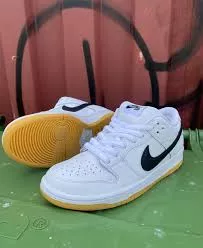 A clean skate-inspired sneaker from Nike SB, featuring white leather uppers with a bold black Swoosh and classic gum outsole. Built for durability and comfort, the Dunk Low Pro blends skateboarding performance with timeless streetwear style.
