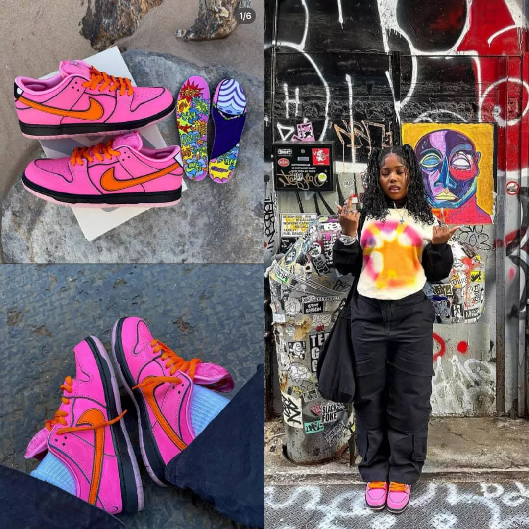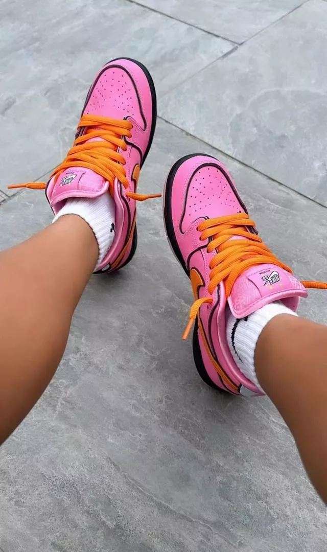 The Nike SB Dunk Low Pro x The Powerpuff Girls “Blossom” celebrates the 25th anniversary of the iconic cartoon series. Inspired by Blossom’s signature style, this sneaker features a vibrant pink nubuck upper, an orange Swoosh, and reflective black piping. The heel is embroidered with Blossom’s expressive eyes, while custom Mojo Jojo graphics decorate the insoles. A collector’s piece and statement sneaker, it perfectly blends nostalgia with streetwear appeal.