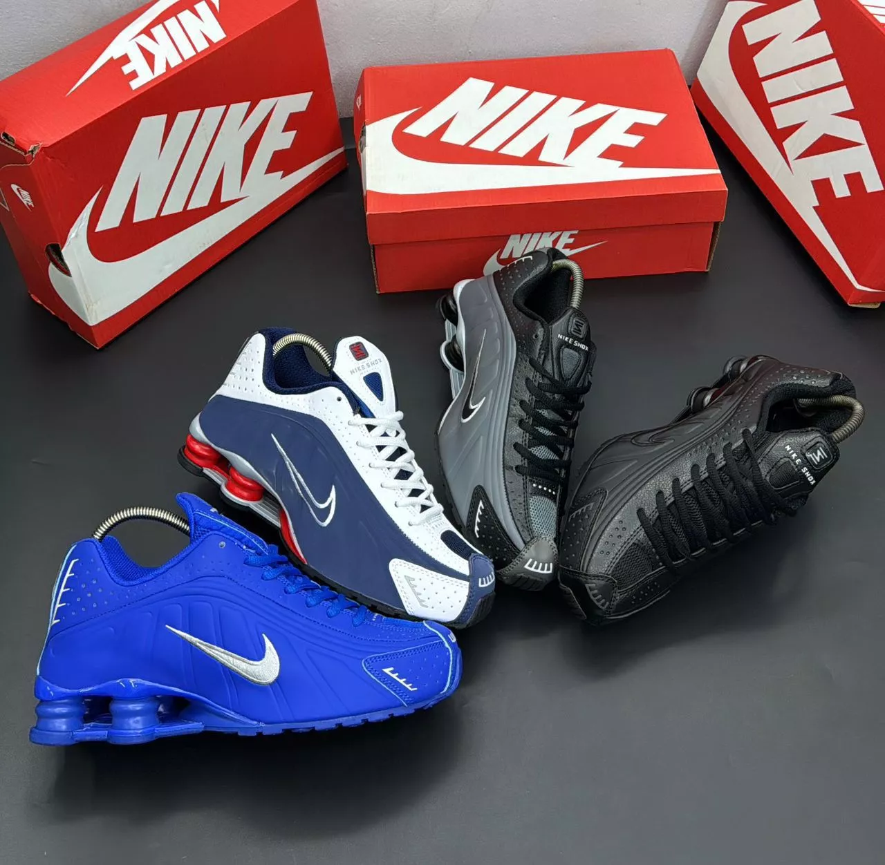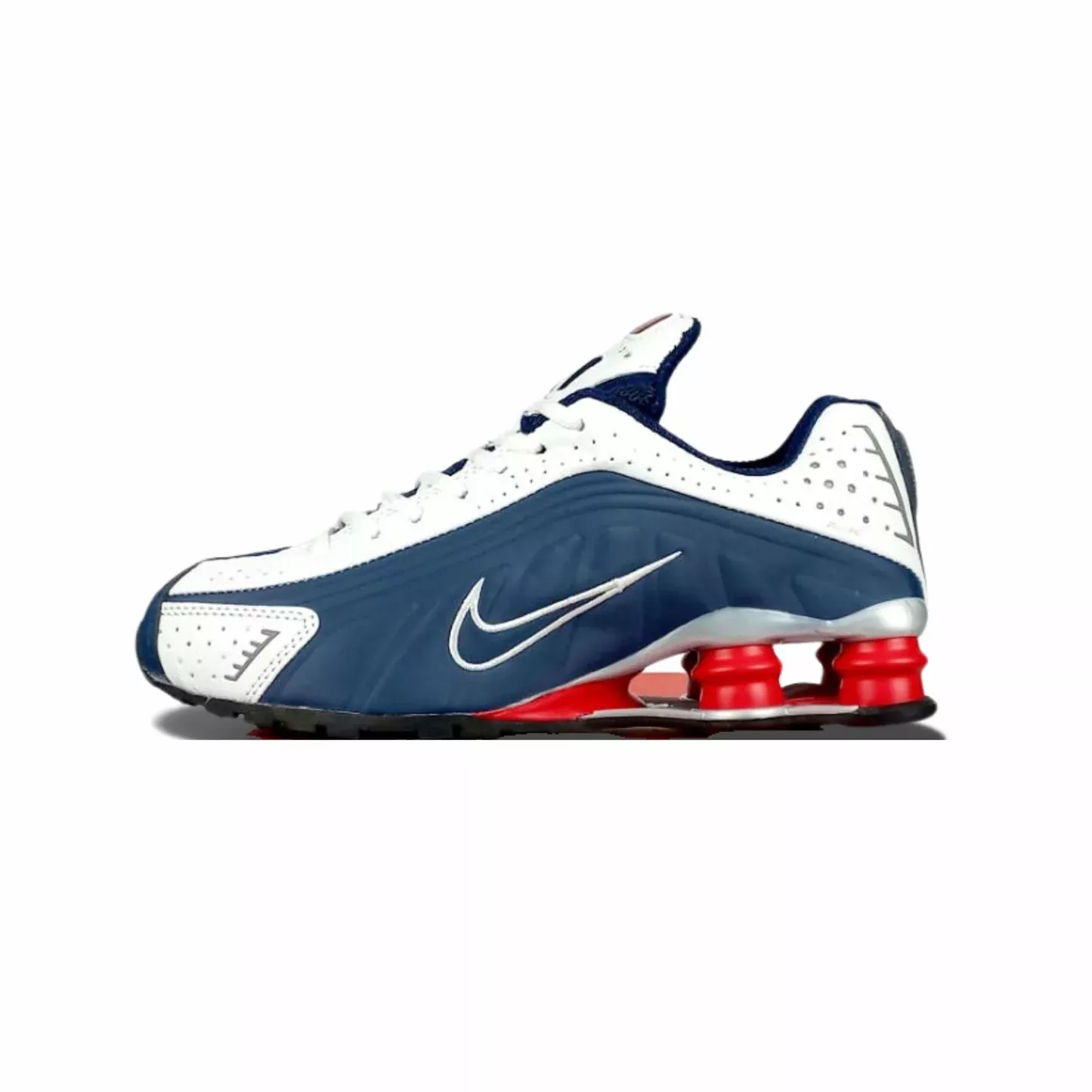Retro running sneakers featuring a sleek synthetic leather upper with perforations for breathability, paired with the iconic Shox cushioning columns for responsive comfort and bold style.