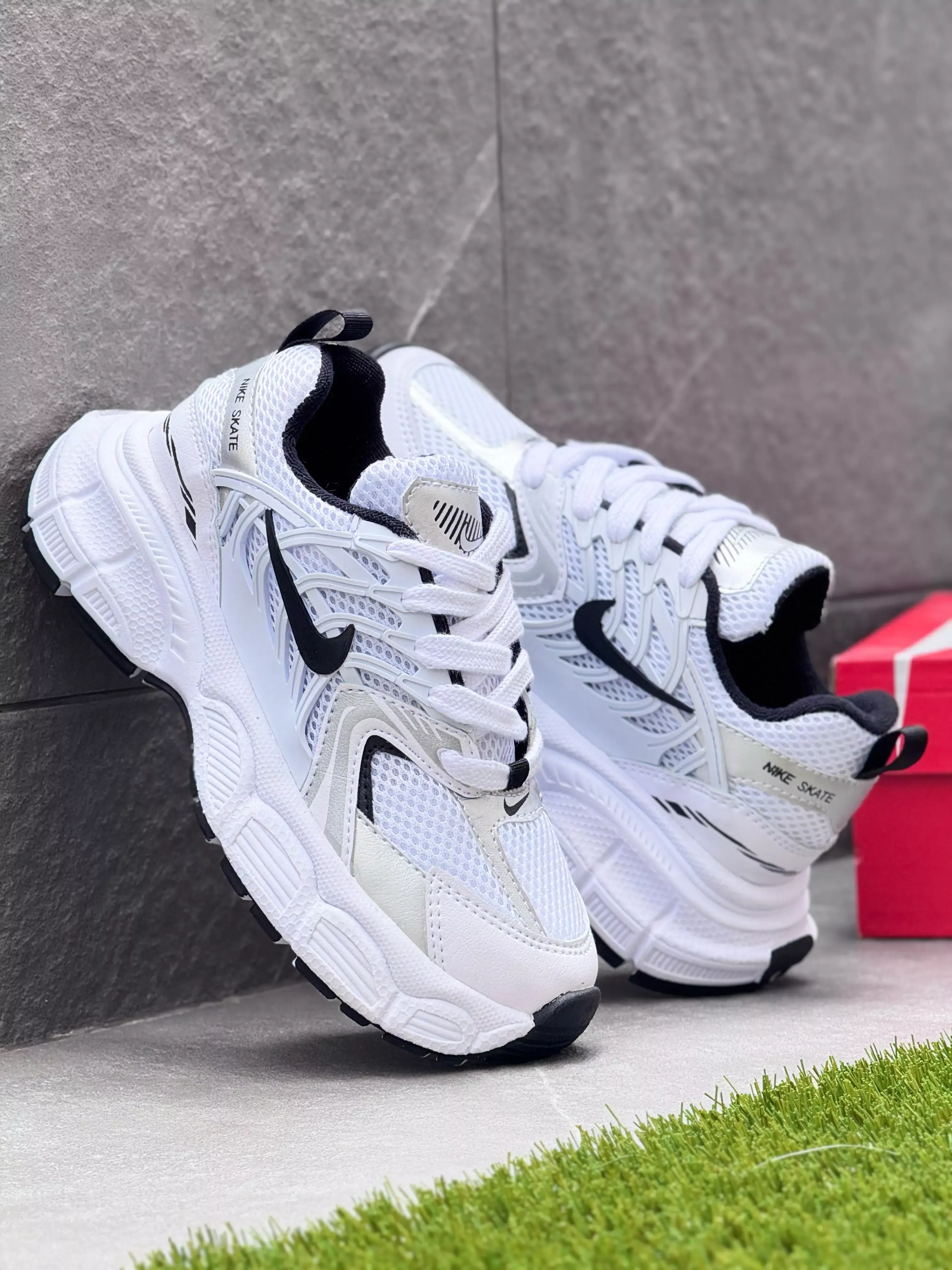 These Nike Skate sneakers feature a clean white upper accented with bold black details for a sharp, classic look. Built for comfort and daily wear, they include metallic silver touches and a supportive sole ideal for casual skate-inspired styling.