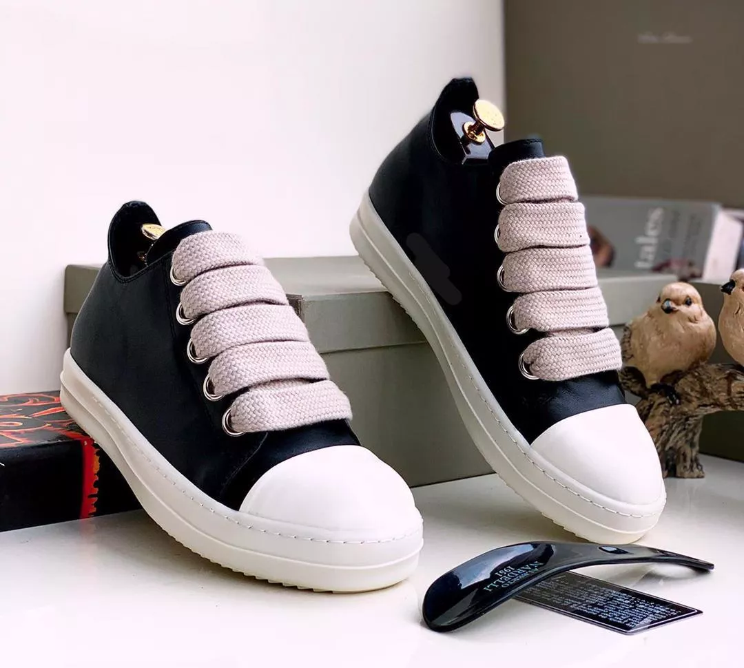 The Rick Owens DRKSHDW Jumbo Lace Low Sneakers bring a bold twist to a classic silhouette. Featuring an all-black canvas upper, contrasting milk-white sole and toe cap, and the brand’s signature oversized beige laces, these sneakers embody Rick Owens’ avant-garde style. Perfect for those who appreciate minimalism with an edge.