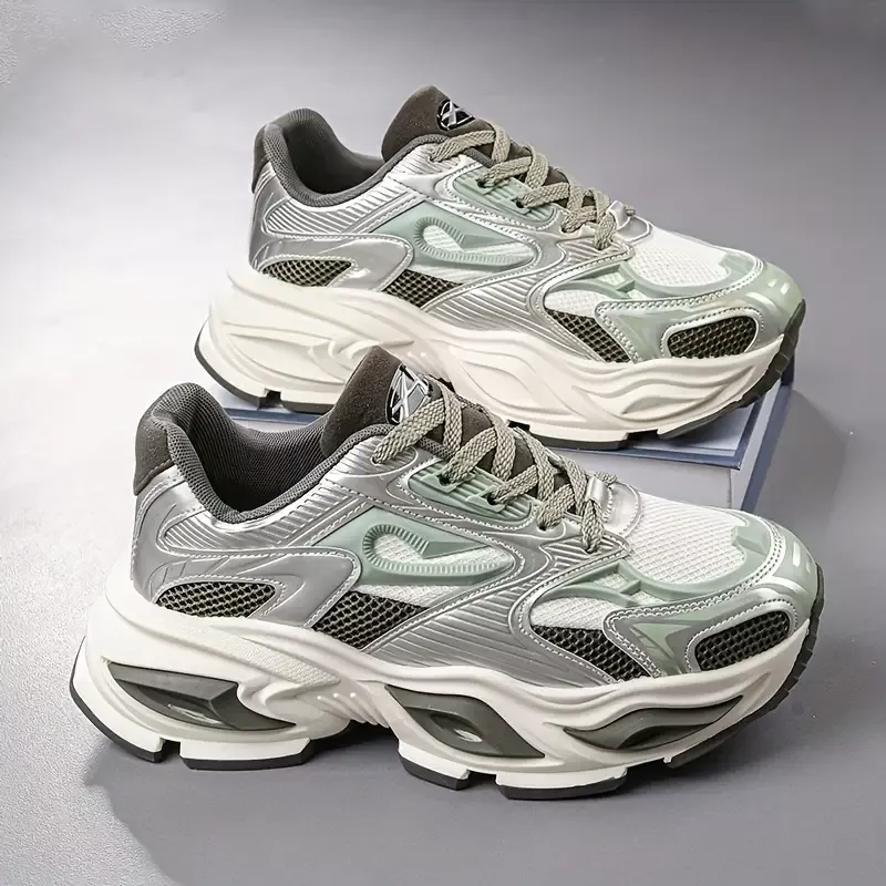 The Slake OGR Tail Ex Series Sneakers feature a bold, chunky design with a mix of white, grey, and mint green tones. Built for comfort and everyday wear, these sneakers offer a modern streetwear look that combines fashion and performance.