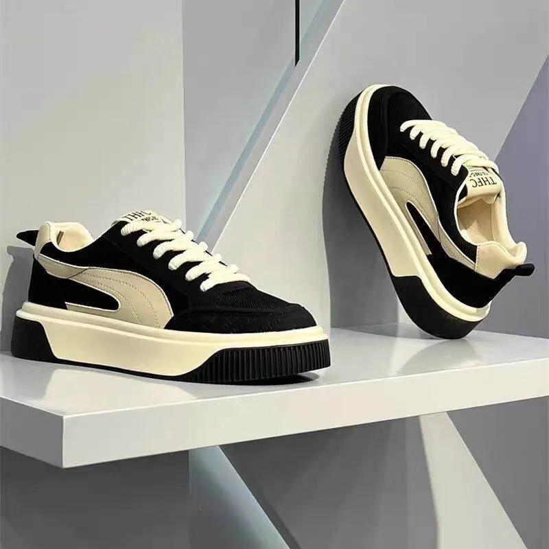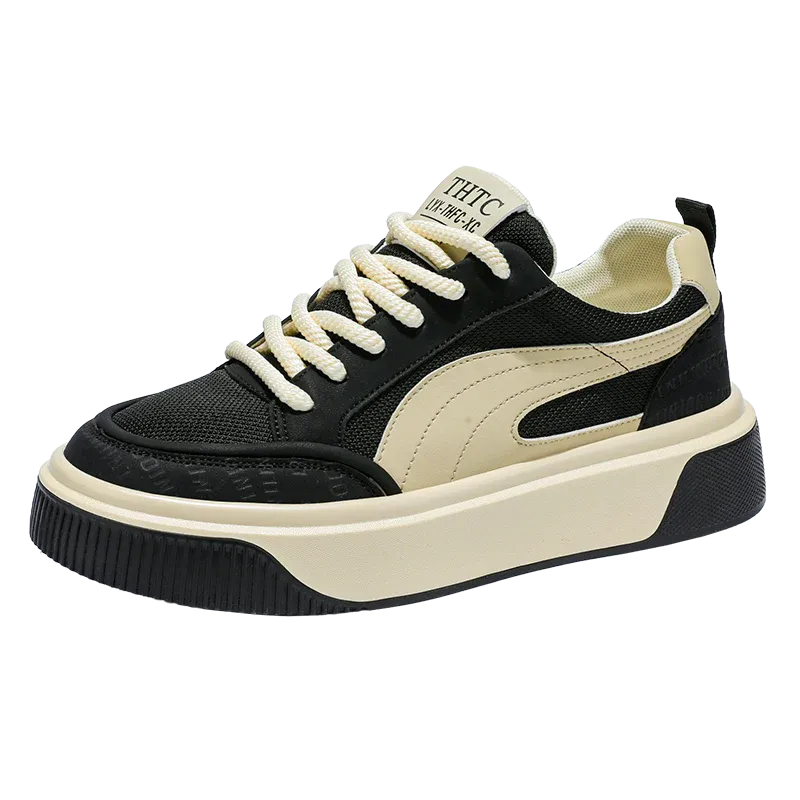 These THFC casual fashion sneakers feature a sleek black upper with contrast cream-colored accents and sole. Designed for everyday style and comfort, they blend a modern look with classic tones, perfect for casual outings or relaxed streetwear.