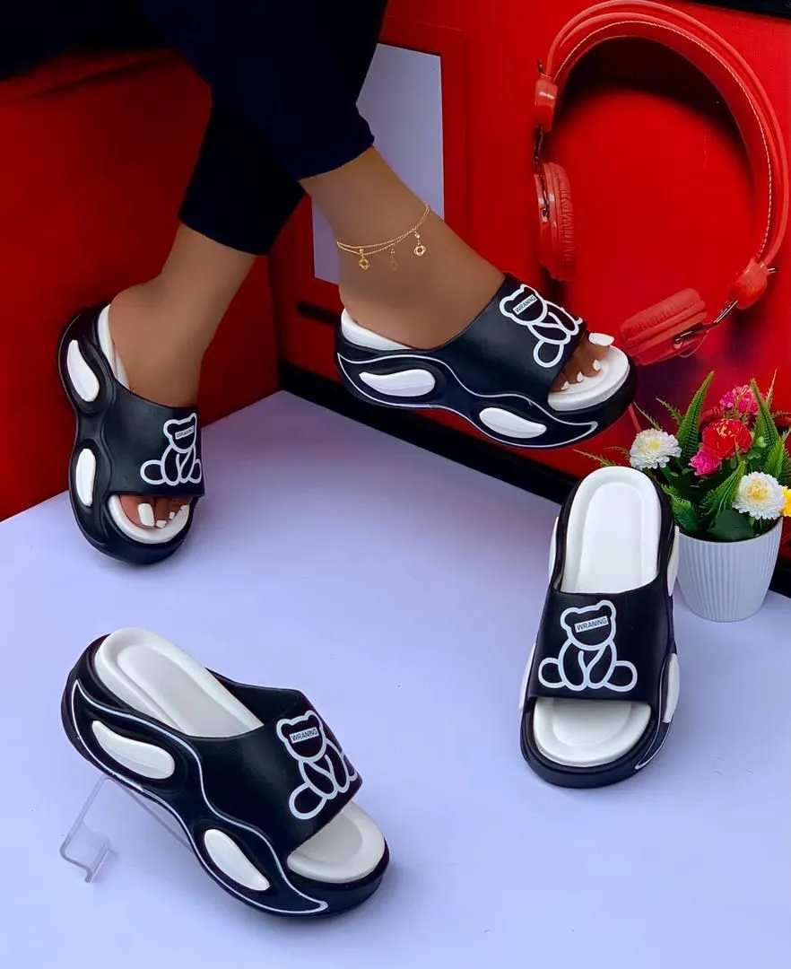 thick-soled cartoon bear pattern slippers – Black/White