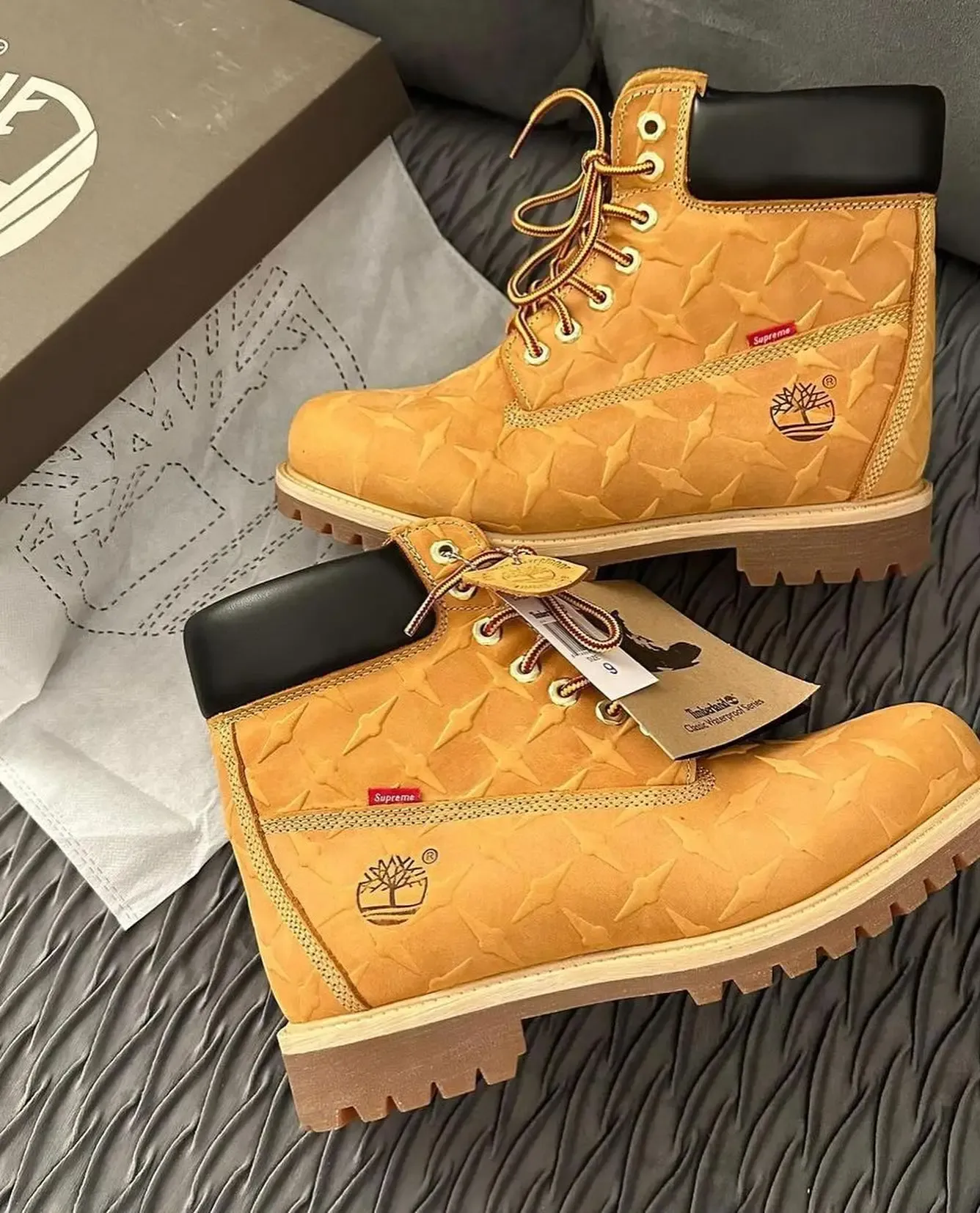 The Timberland x Supreme 6" Premium Waterproof Boot in the Wheat colorway combines Timberland’s iconic rugged build with Supreme’s Diamond Plate detailing for a bold street-luxury edge. Built for durability, comfort, and all-weather wear.