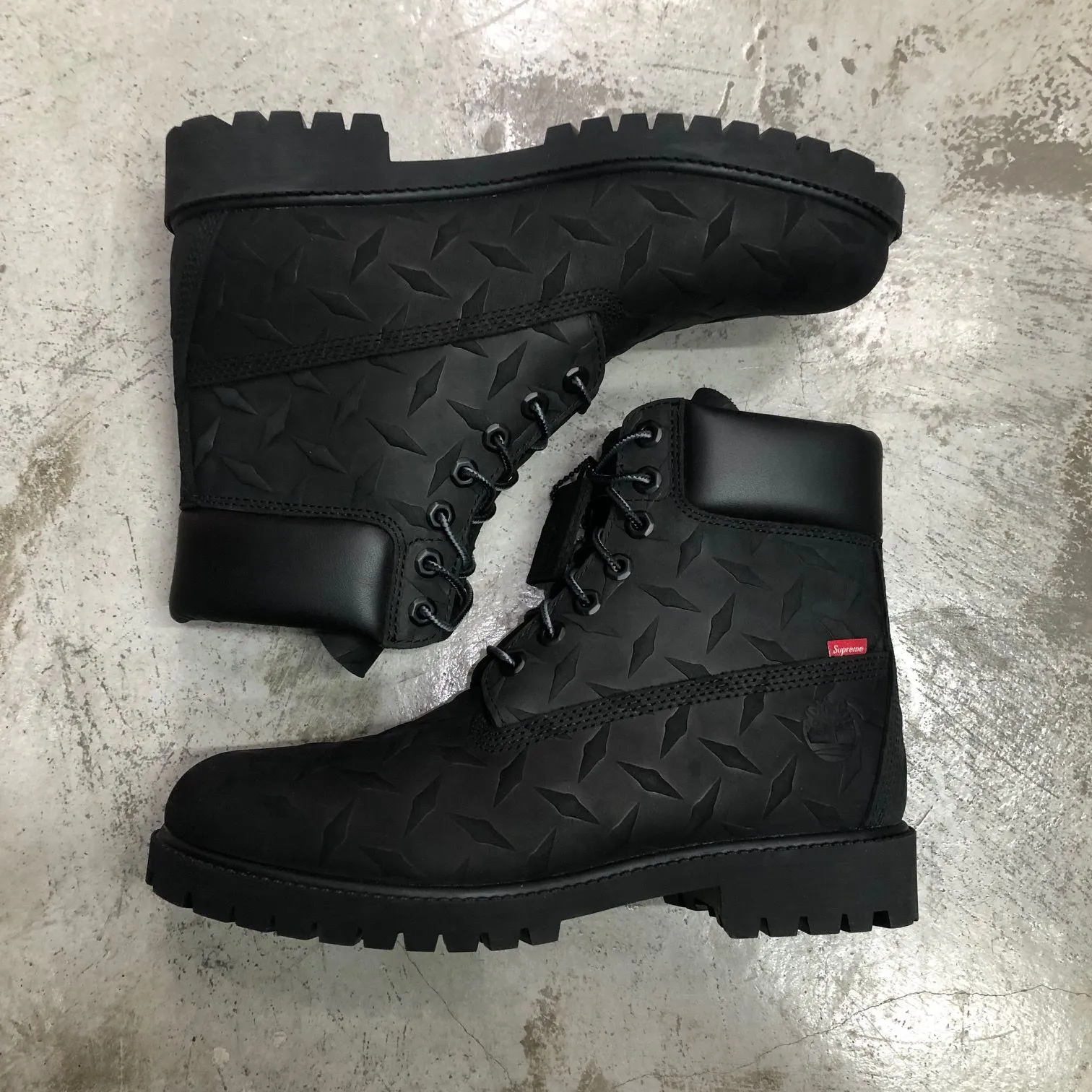 The Timberland x Supreme 6" Premium Waterproof Boot in black nubuck leather features embossed Diamond Plate detailing, blending classic rugged durability with Supreme’s bold streetwear aesthetic. Designed for all-weather performance and everyday wear.