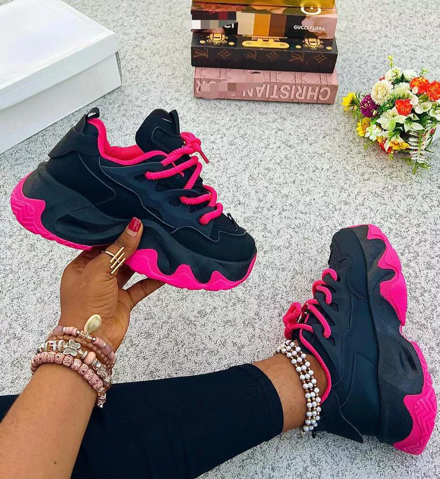 Trendy Bold Lace-up Sneakers Black and Pink Lace