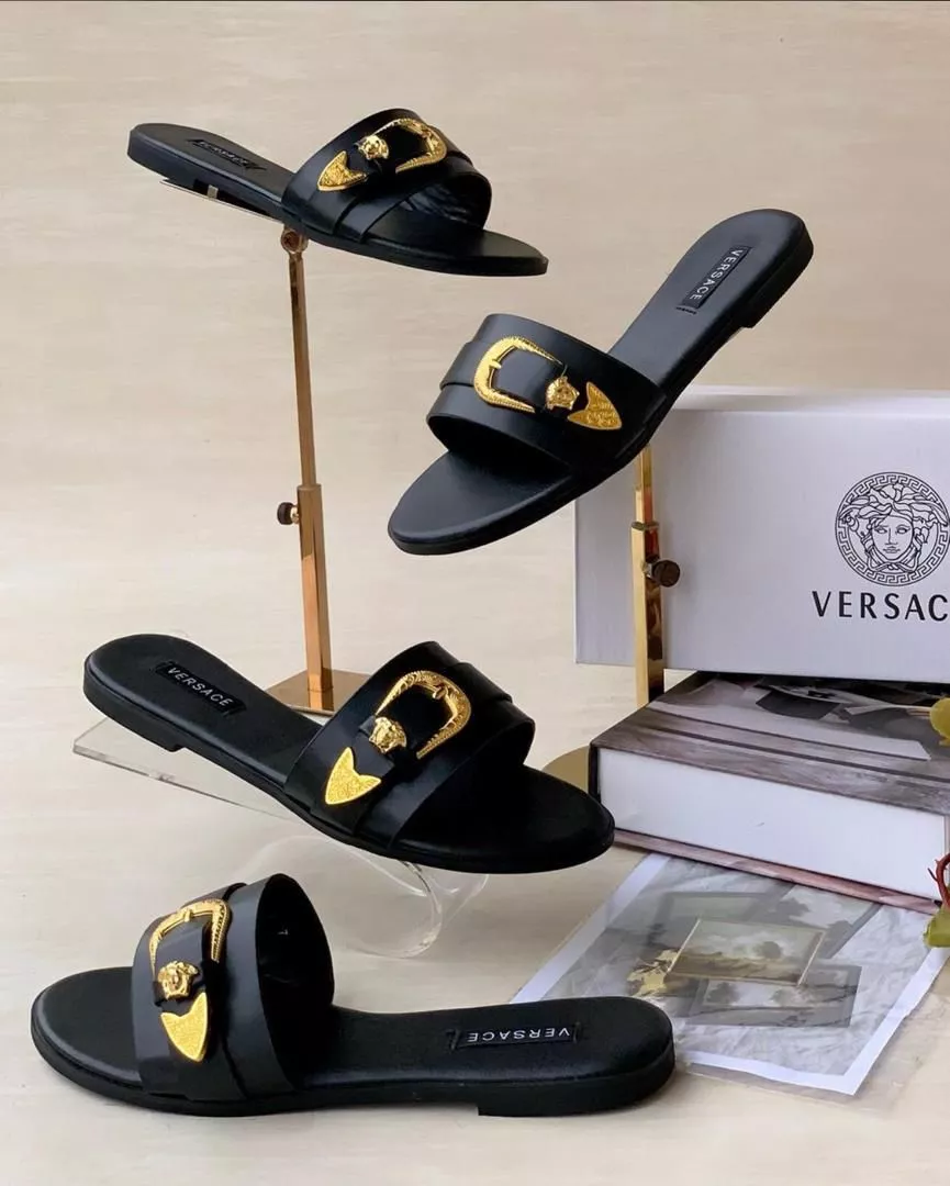 These Versace-style slippers feature a sleek black base paired with a bold gold-tone buckle showcasing the iconic Medusa emblem. Designed for a luxury look with everyday comfort, they blend premium feel, stylish branding, and a sturdy slip-on design.