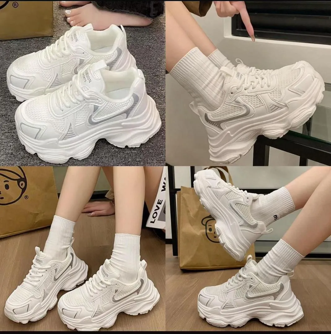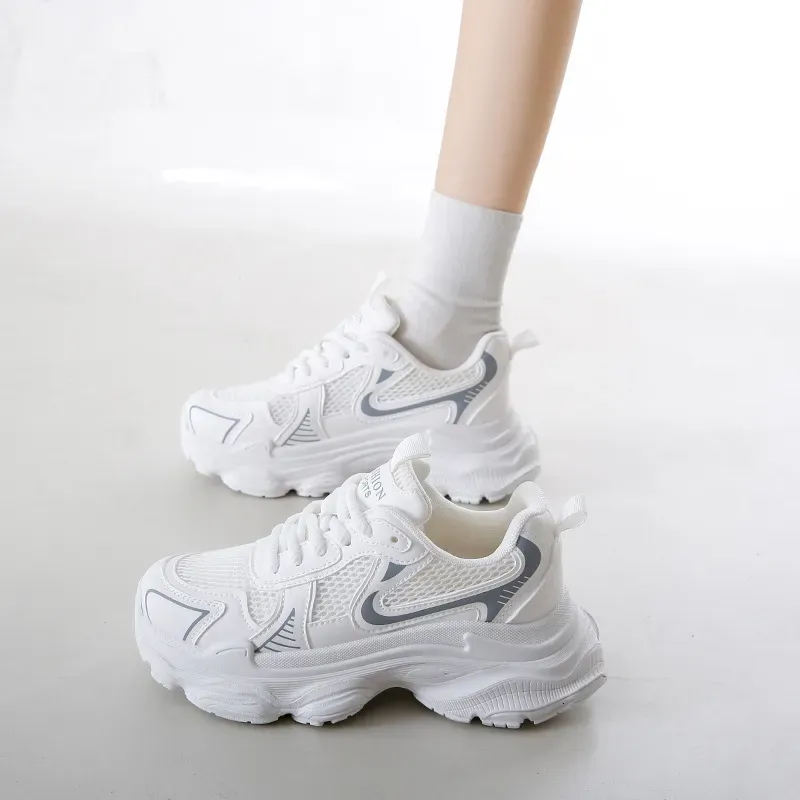 These women’s chunky mesh sneakers feature a modern, sporty silhouette with a breathable mesh upper and layered synthetic overlays. The clean white base is complemented by grey and silver accents, giving the shoe a sleek, contemporary look. Finished with a thick cushioned sole, they’re designed for everyday comfort while keeping the popular “dad sneaker” aesthetic.