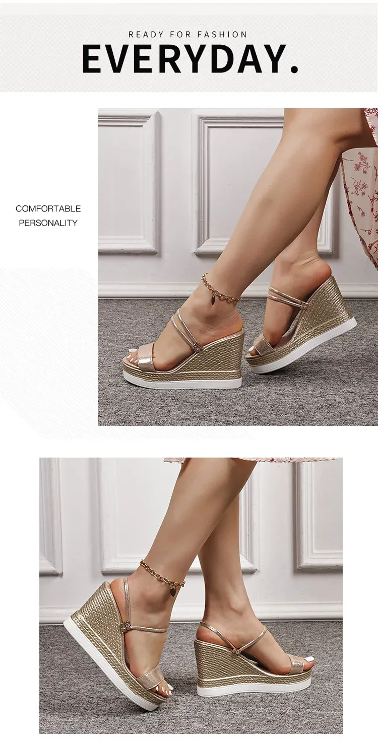 Step up your style game with these women's platform wedge sandals in a striking gold finish. The perfect complement to your summer wardrobe, these sandals combine comfort and elegance in a design that's both chic and practical.