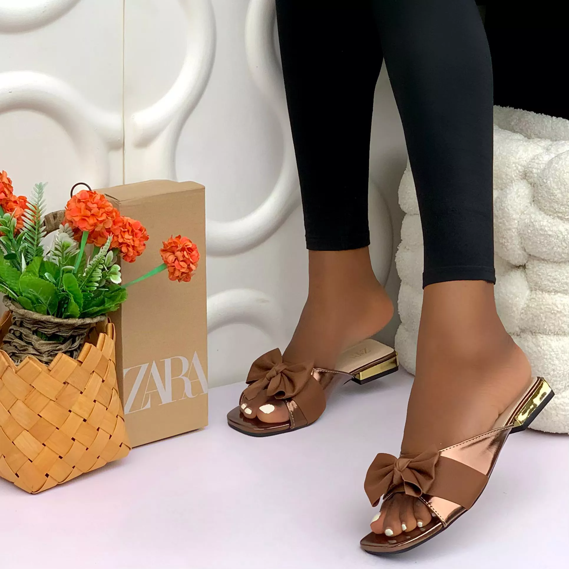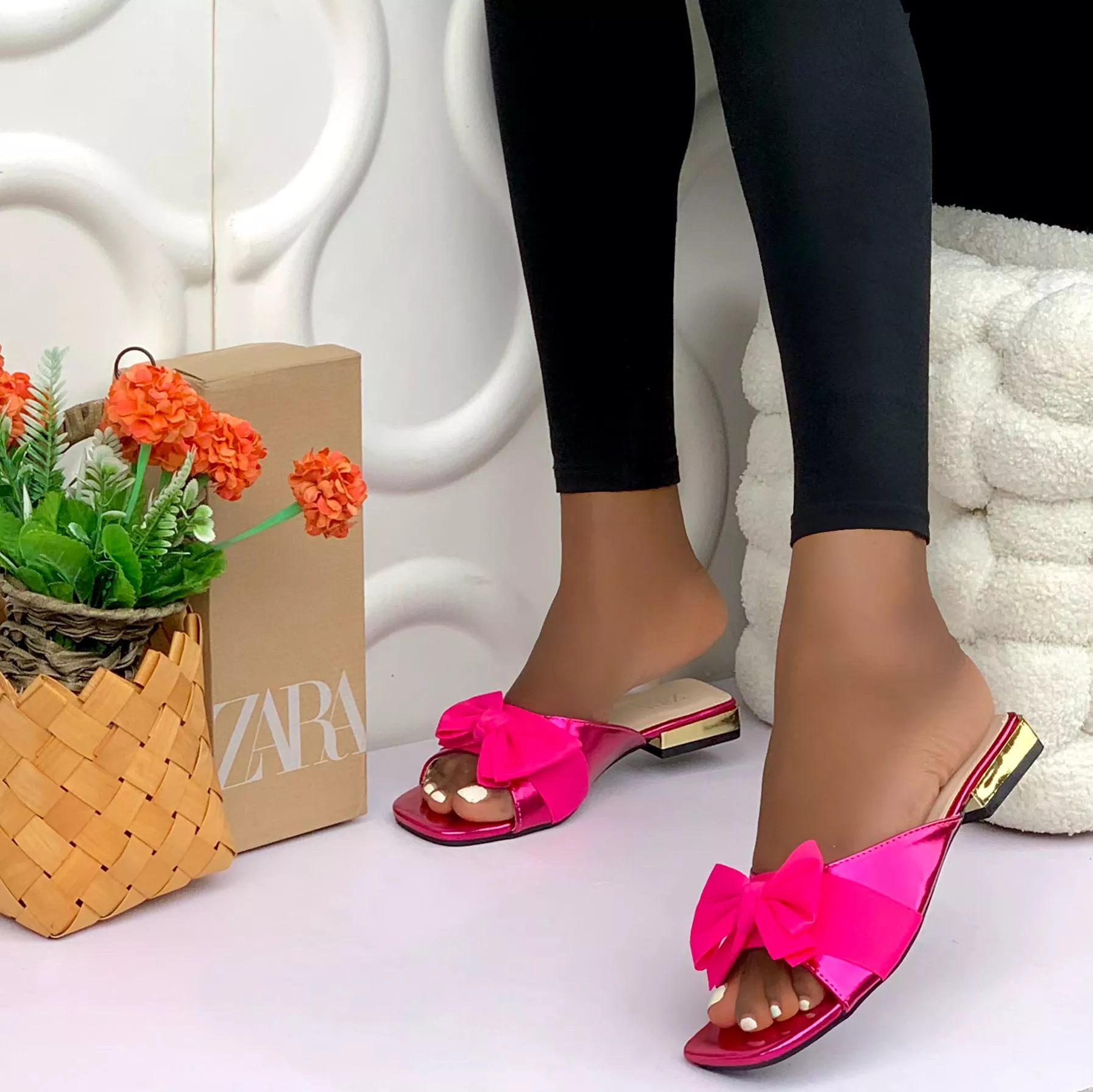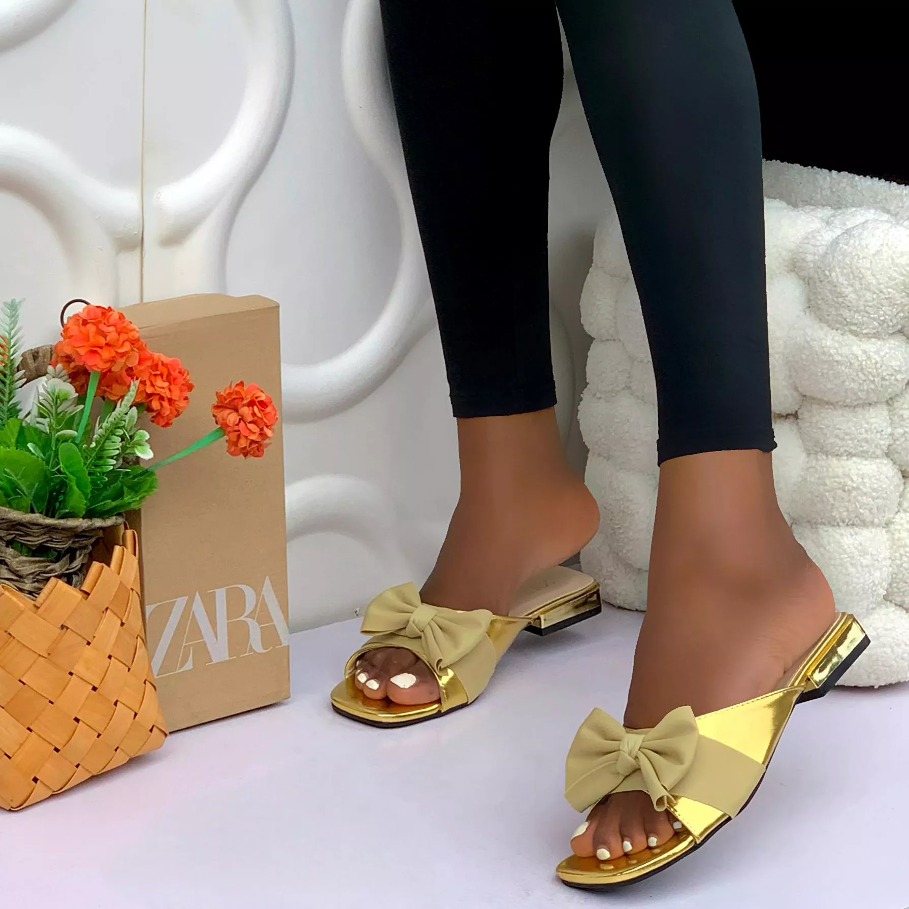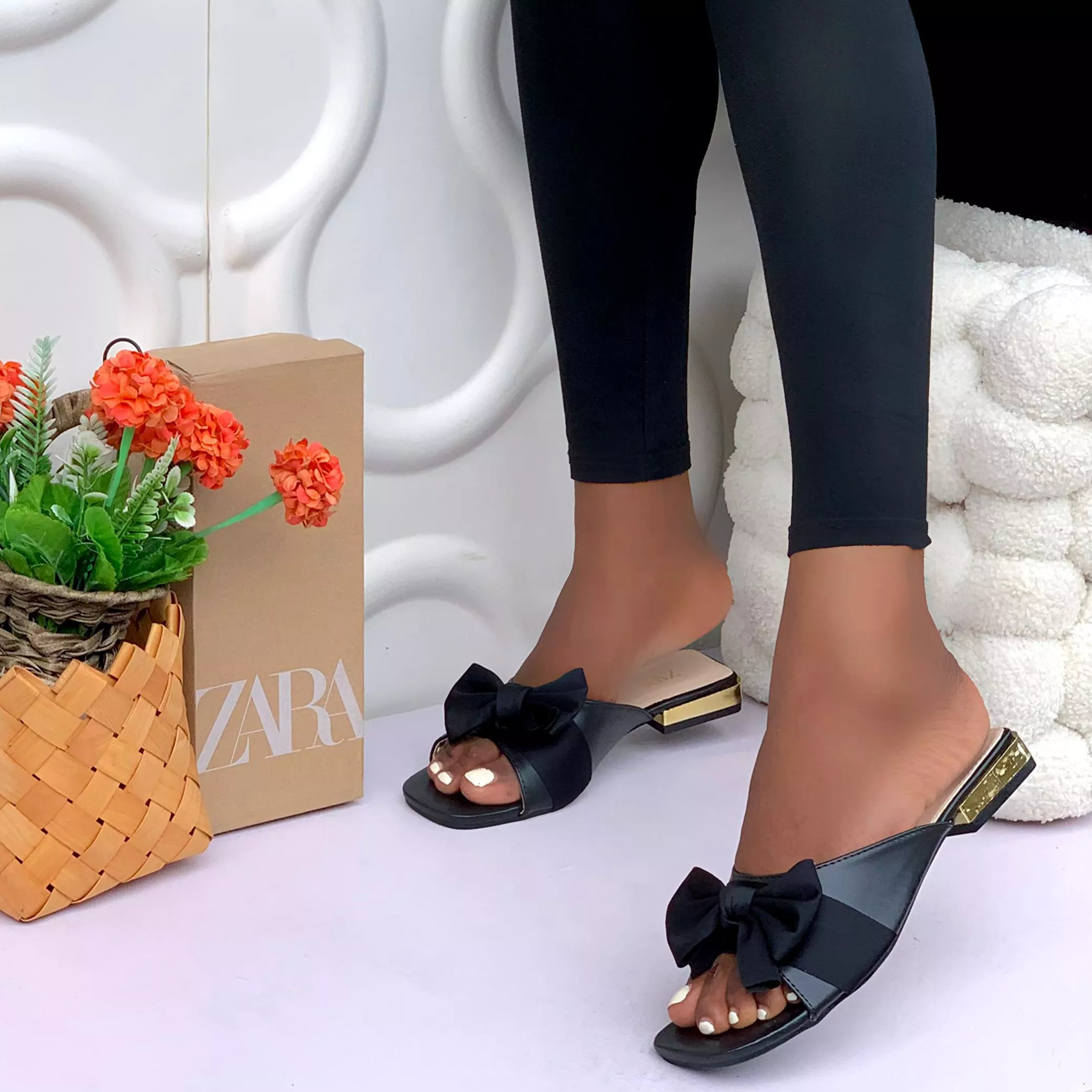 A large, neatly tied bow made of the same material as the upper strap is the focal point, adding a feminine and decorative touch.