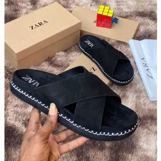 These Zara Slide Pam Slippers feature a soft black suede-like upper with wide crossed straps and a chunky ridged platform sole. Designed for everyday comfort and a modern minimalist look, they include white contrast stitching around the edges for a stylish finish.