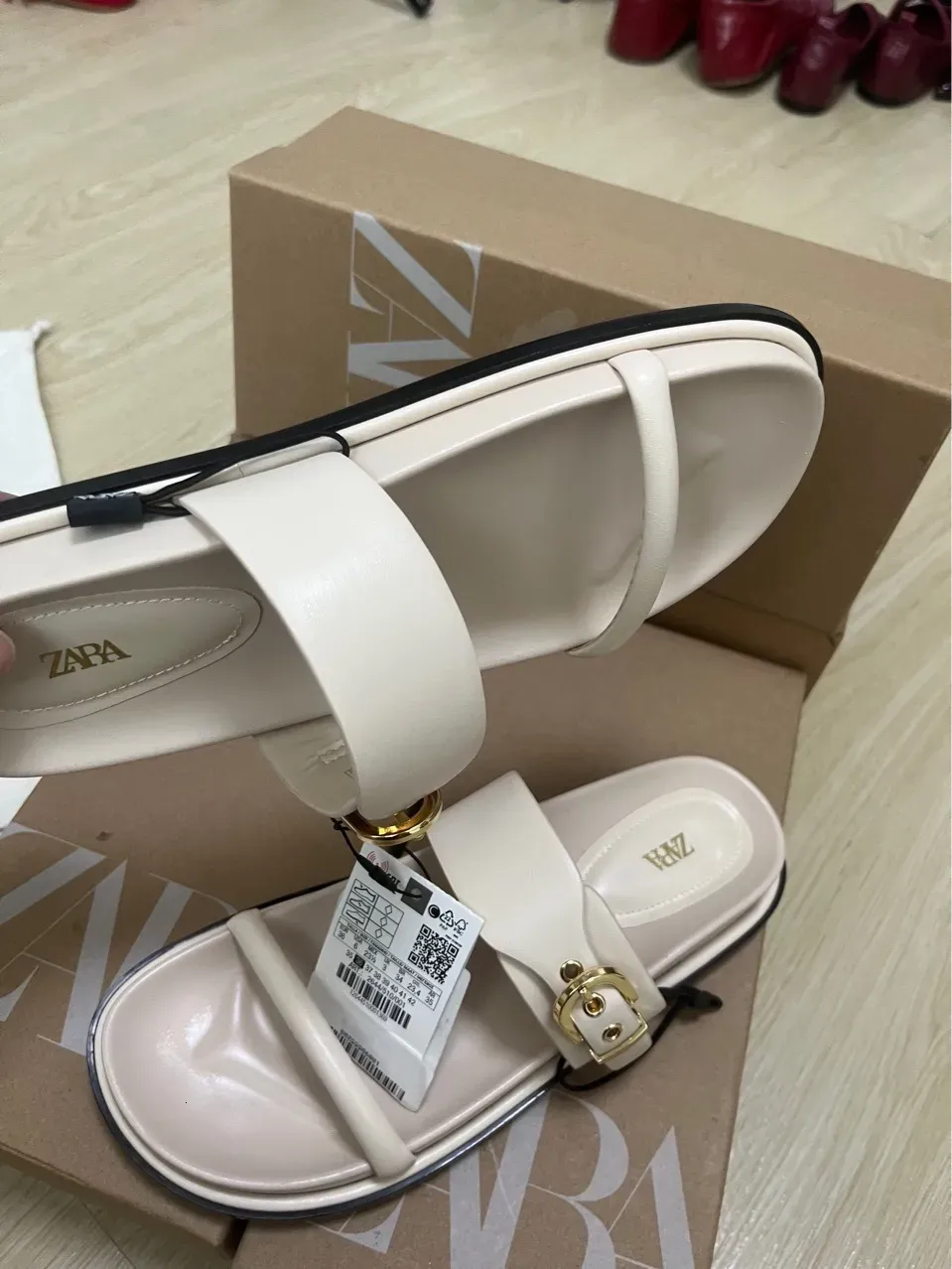 Zara Women’s Double-Buckle Slide Sandals in white feature a minimalist two-strap design with adjustable buckles for a secure and comfortable fit. Finished in a clean cream/white tone, these slides are perfect for everyday wear, offering effortless style with a modern edge.